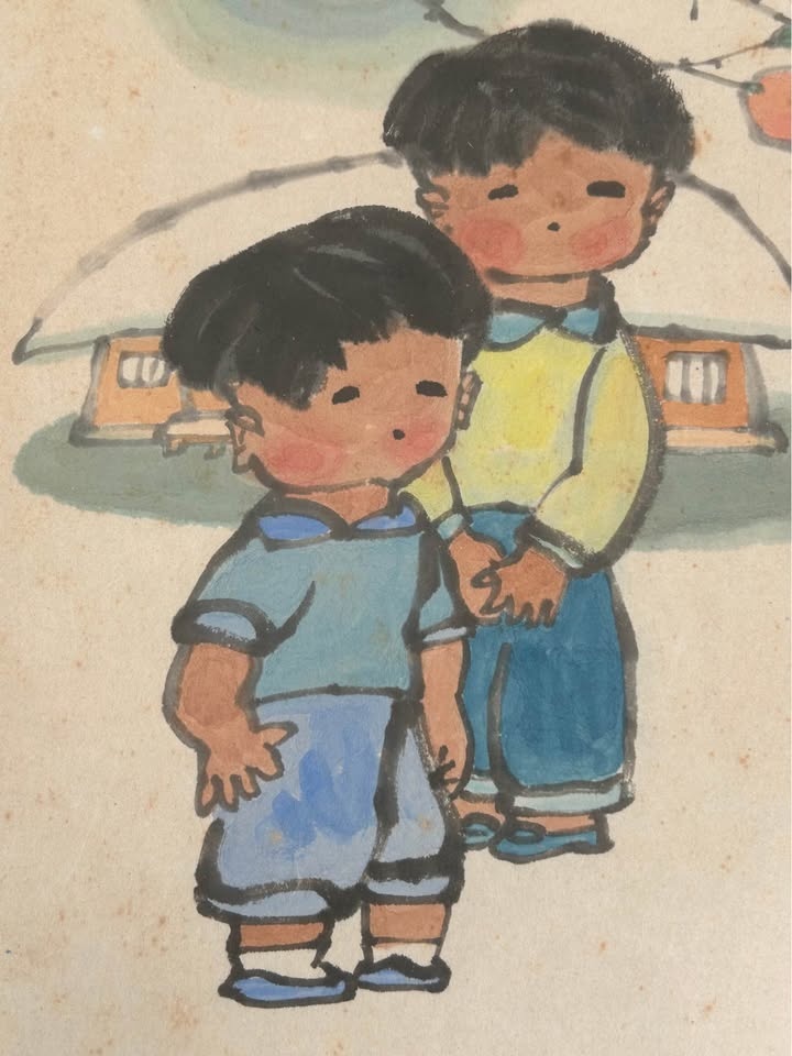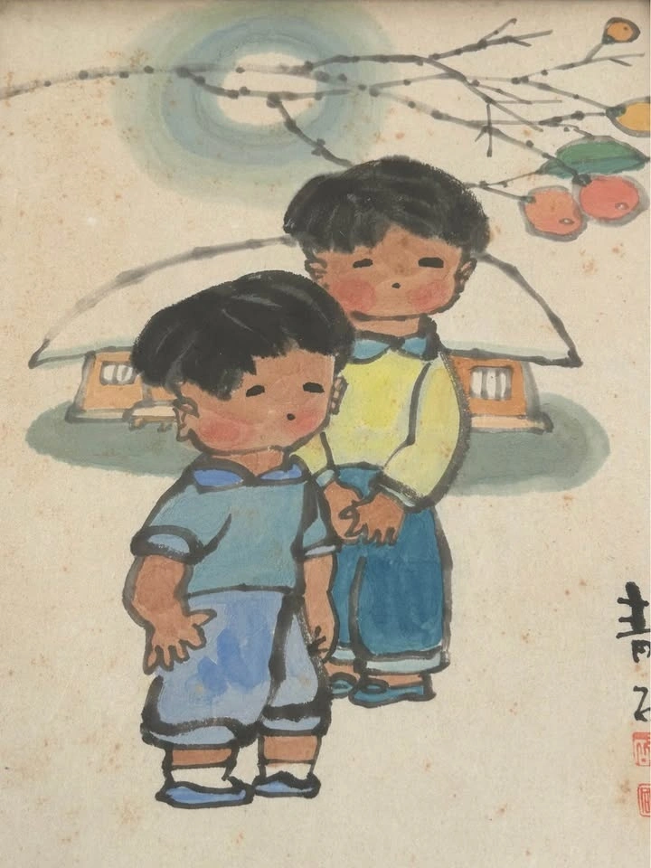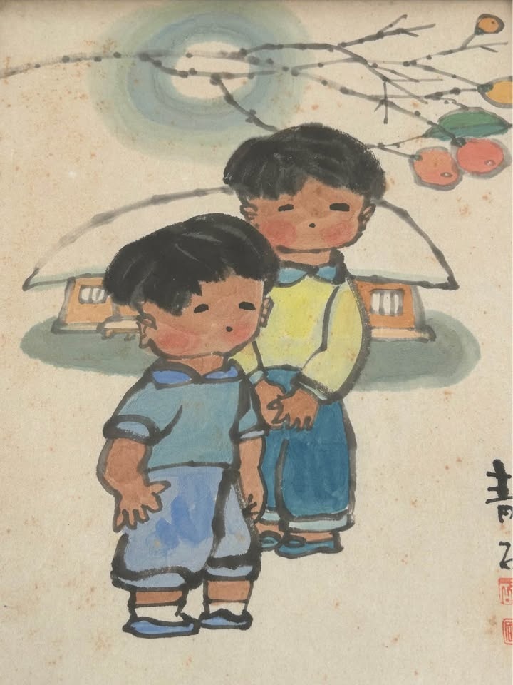 Charming vintage folk art painting depicting two children in a serene, Asian-inspired scene with blossoming branches and traditional architectural elements in the background. Rendered in a soft, illustrative style with gentle colors and expressive simplicity, this piece reflects mid-20th-century decorative art influenced by East Asian aesthetics.