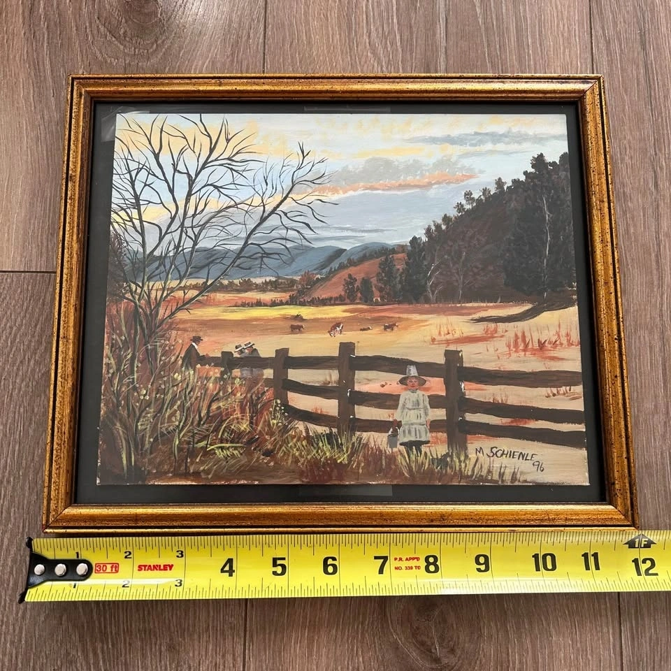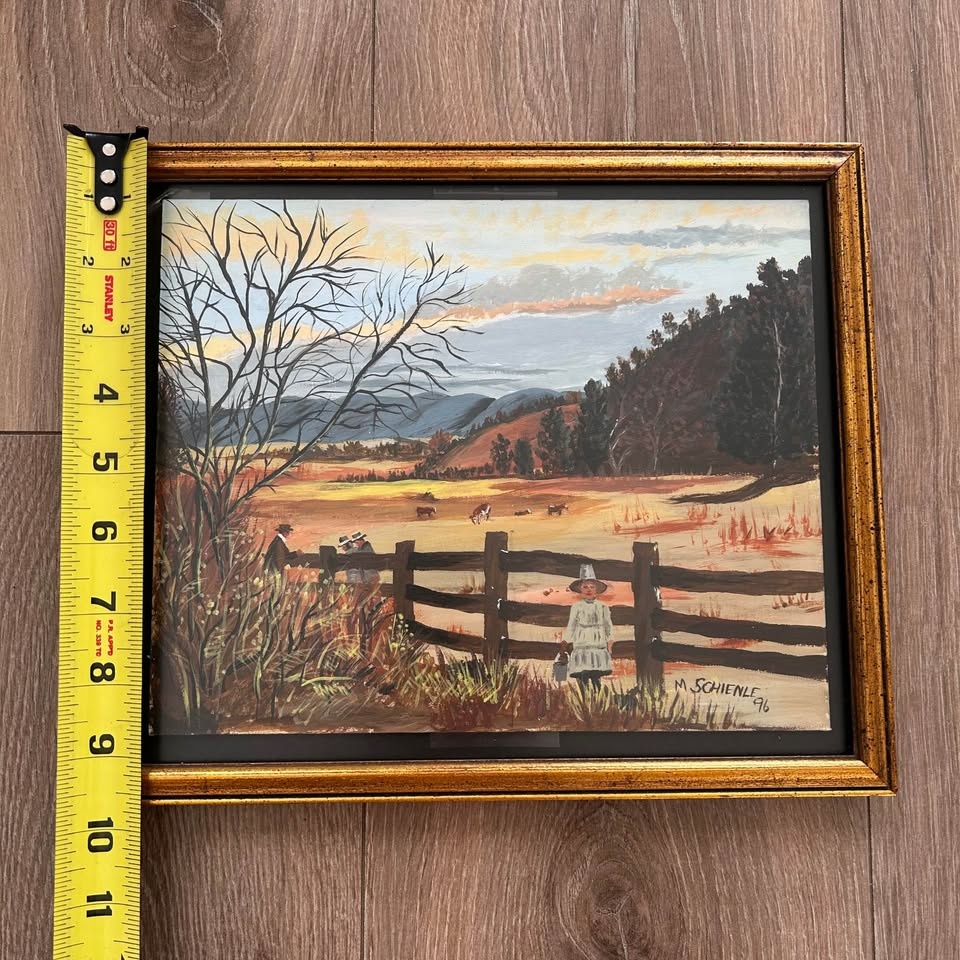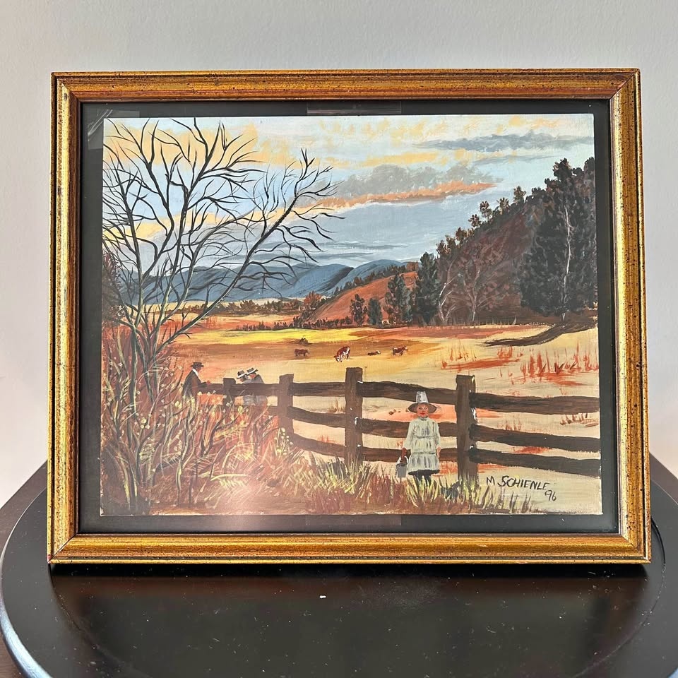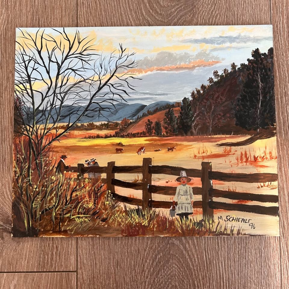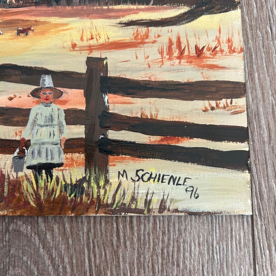 Original hand-painted Canadian folk art scene signed M. Schienle, 1996, depicting a rural landscape from the Armstrong area, British Columbia. The composition features a pastoral countryside with figures, fencing, cattle, and rolling hills, rendered in a warm, expressive naïve style characteristic of late 20th-century folk painting.