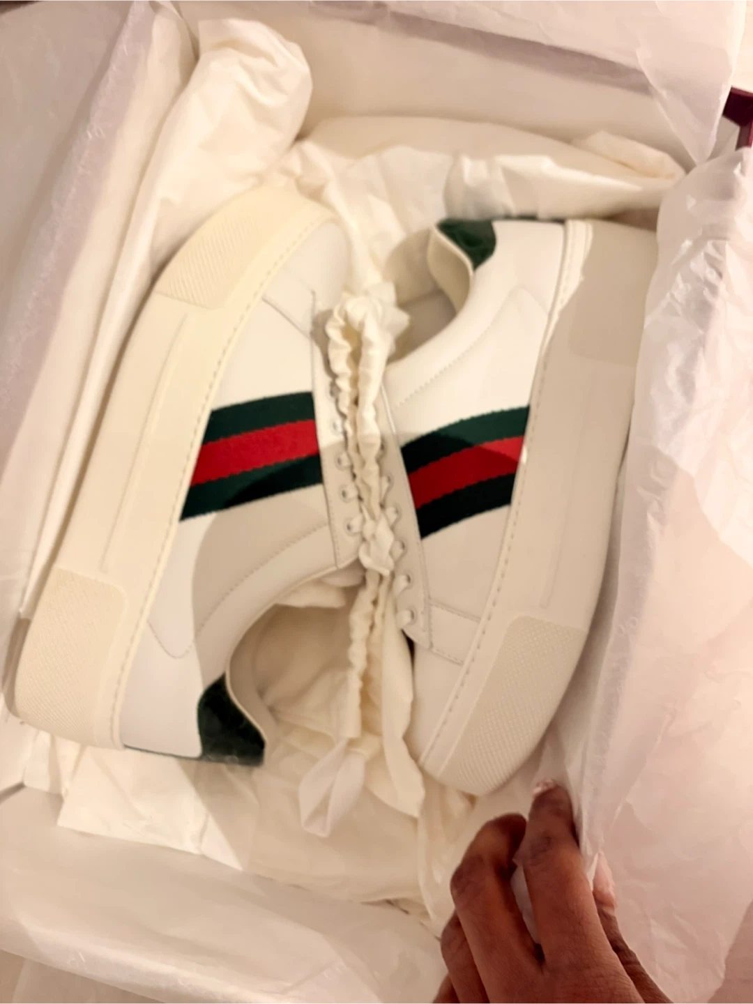 Selling a pair of authentic Gucci platform sneakers for women. They are a size 37 (European) size 7. The sneakers feature the classic green and red stripe design. Comes with the original box, dust bags, & extra laces.