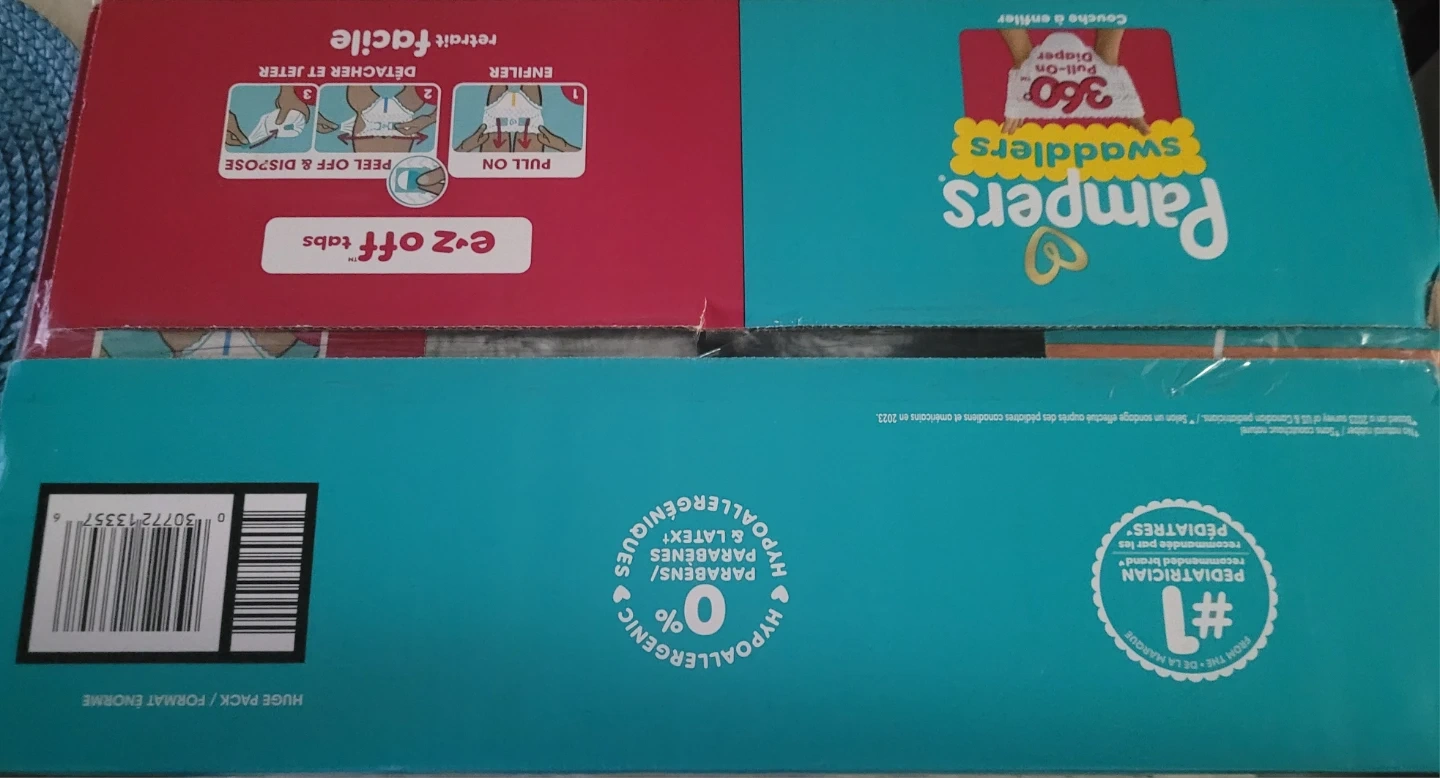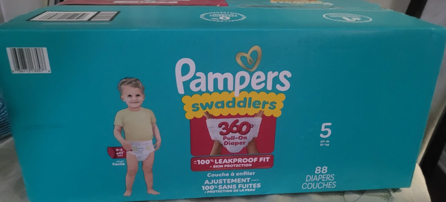 Selling a box of Pampers Swaddlers diapers, size 5. The box contains 88 diapers, perfect for babies 27+ lbs (12+ kg). They feature a 360° pull-on diaper design for easy changes and a 100% leakproof fit with skin protection.