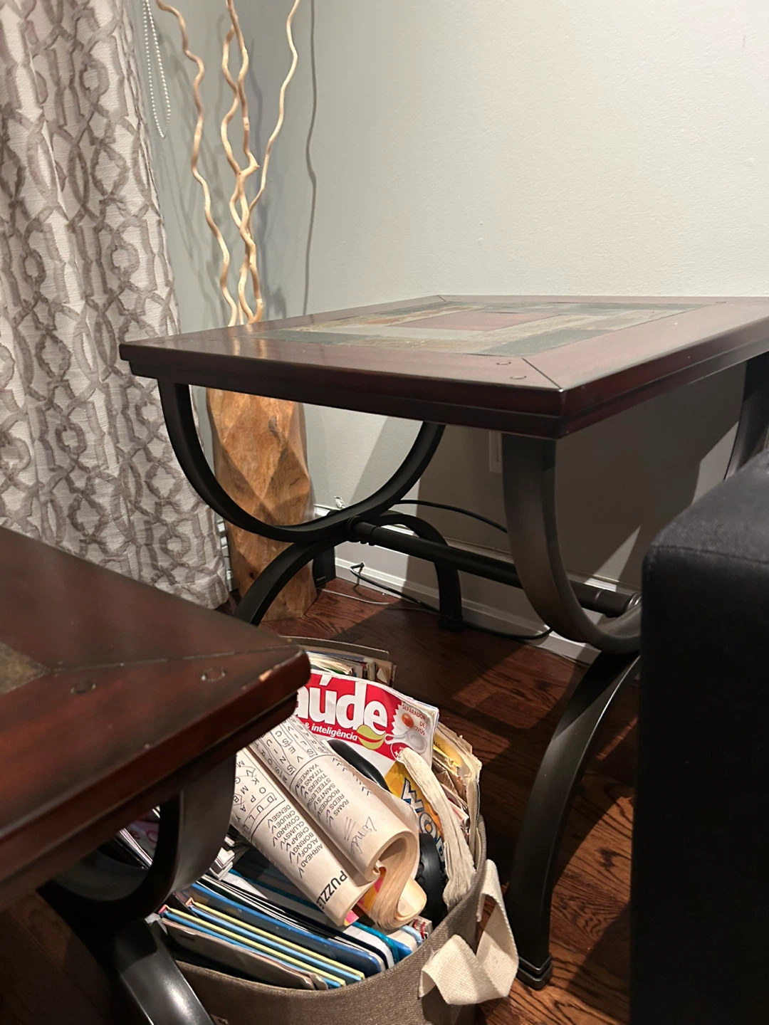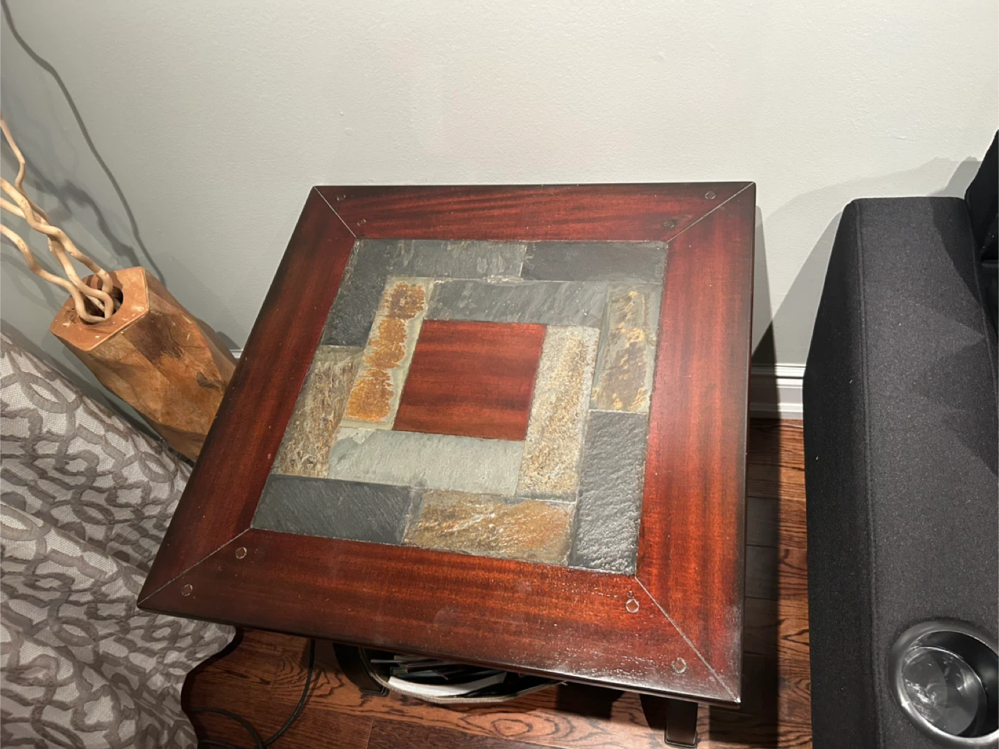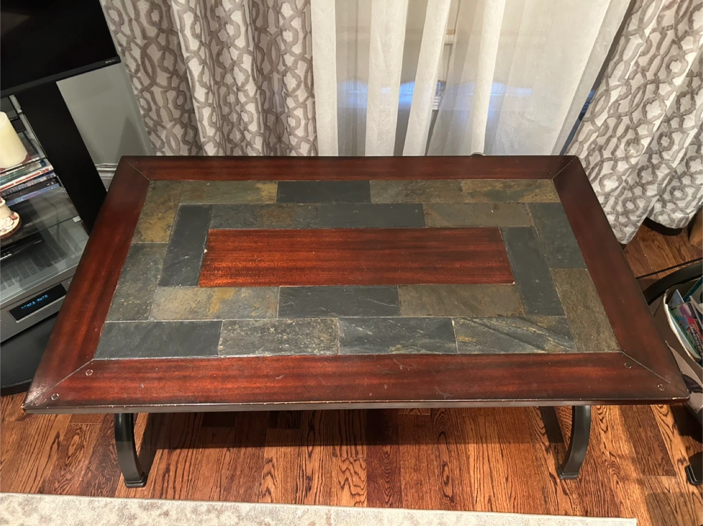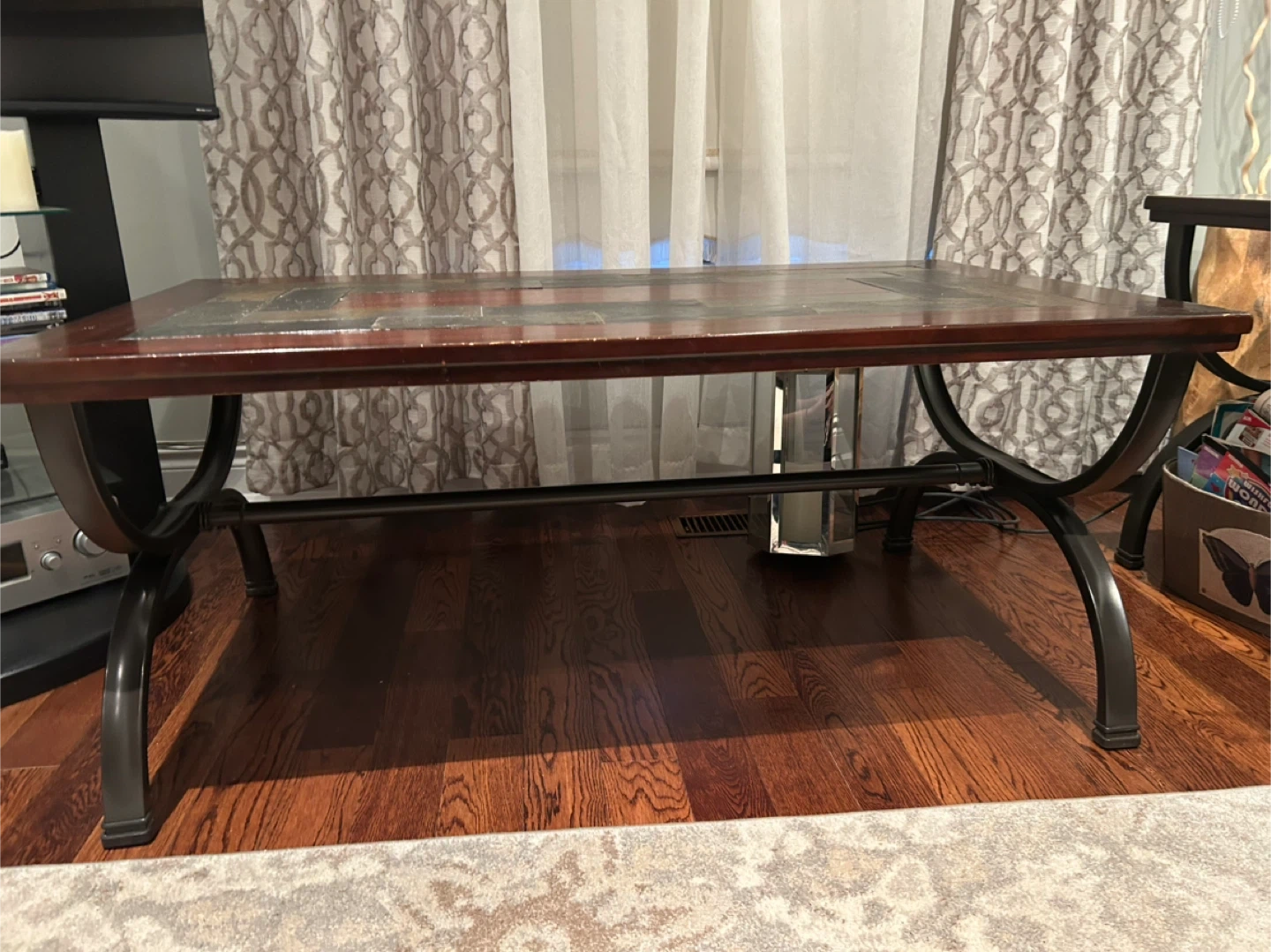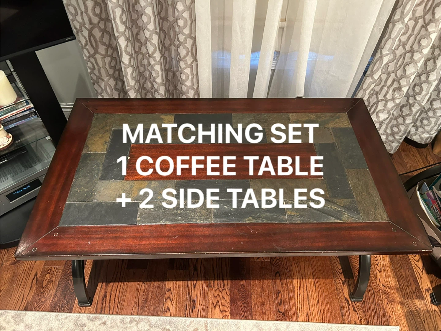 Selling a coffee table and matching 2 end table set. The tables have a dark wood finish with a unique stone tile inlay on top. The coffee table is rectangular, and the end table is square. The legs are a curved, wrought iron style. They're in great shape and would look great in your living room