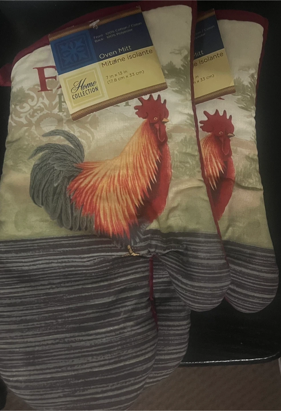 Pickup only ๐Ÿš˜ Serious inquiries only ๐Ÿ™ Pair of new oven mitts from Home Collection! They have a fun rooster design on the front and are made from 100% cotton with a polyester back. Each mitt measures 7 in x 13 in (17.8 cm x 33 cm)