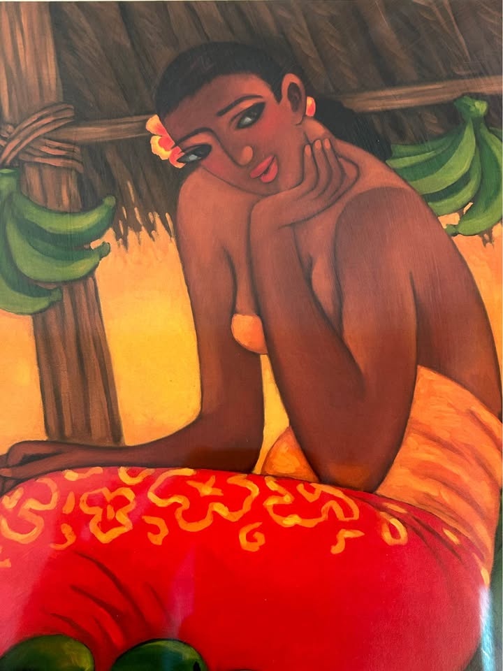 • Style: Gauguin-style figurative painting featuring warm, tropical colors.