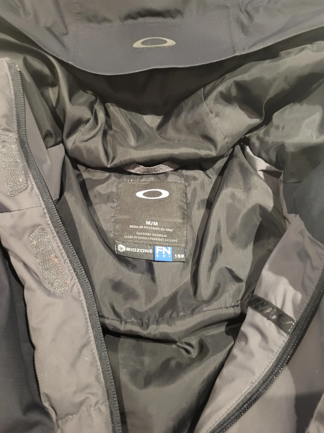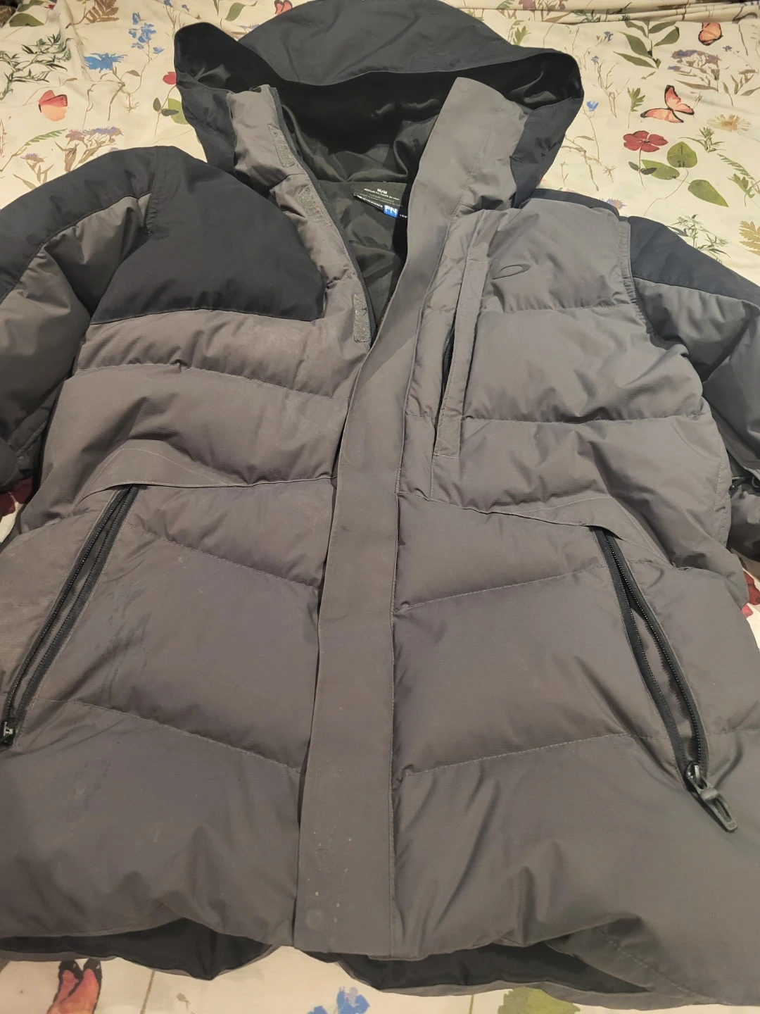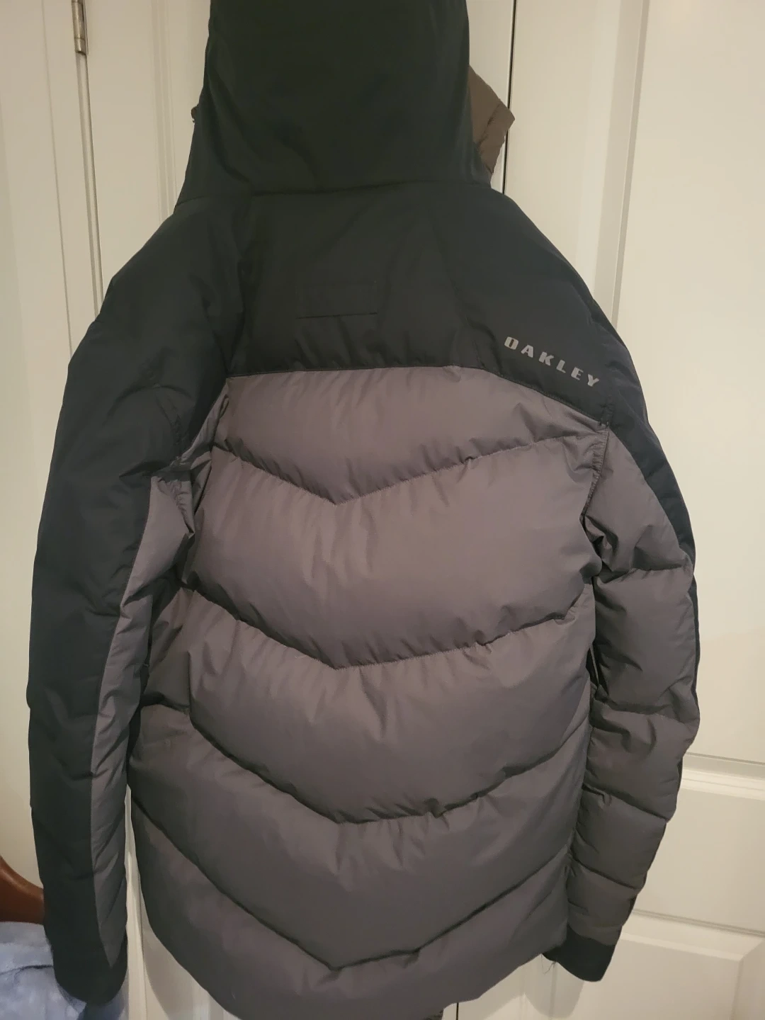 Here's a stylish Oakley puffer jacket in size medium. It's a mix of black and grey, perfect for staying warm and looking good this winter. The jacket has a hood and several pockets for convenience. Feel free to ask if you have any questions!