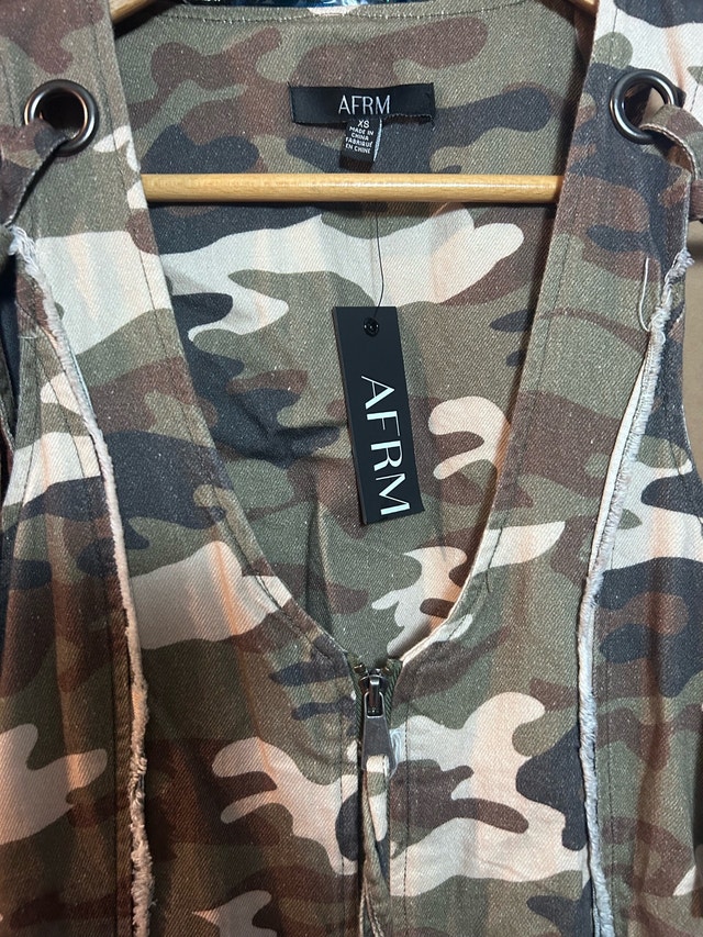 This AFRM camo maxi dress is brand new with tags, size extra small. It features a stylish zip-up front and a trendy front slit. Additional Specifications: * Brand: AFRM * Size: XS * Colour: Camo * Dress Length: Maxi * Style: Bodycon This dress is new and has all the original tags still attached. Pick up in Springbank Hill or Royal Oak. Serious inquiries only, please.