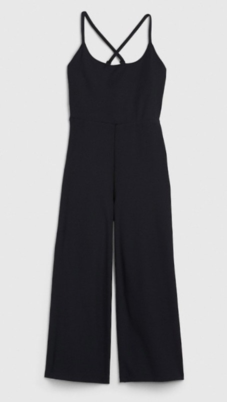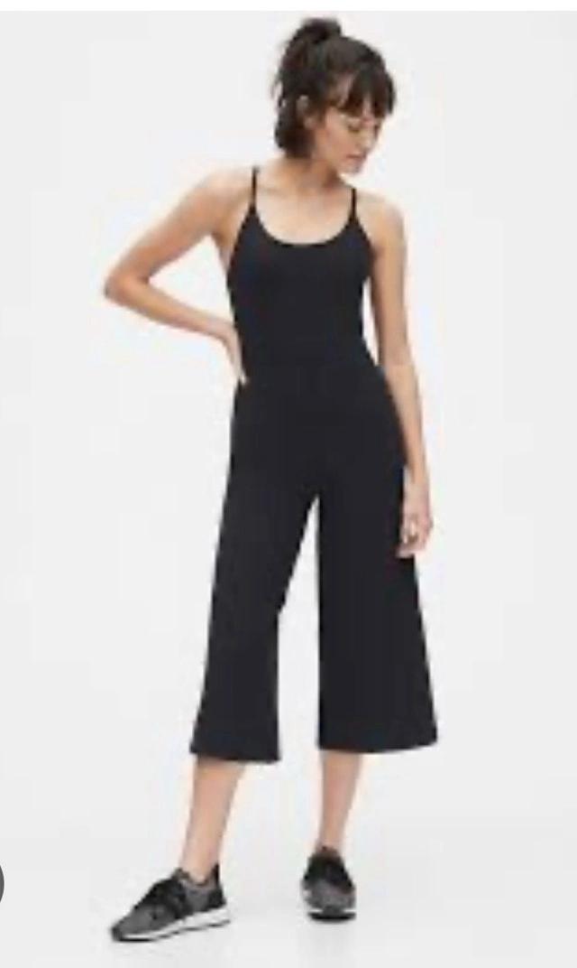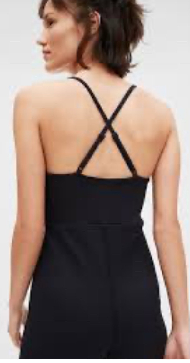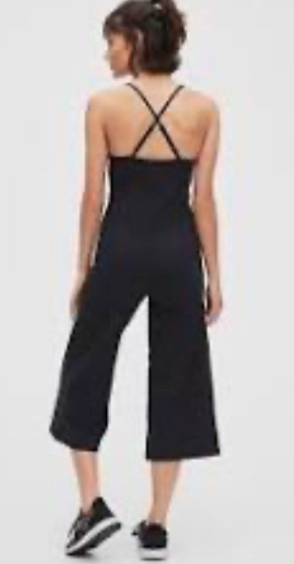 I'm selling a Gap Black Jumpsuit in size XS with a stylish cross-back design. This jumpsuit features a comfortable, breathable high-performance fabric with quick-dry technology. gDry moisture wicking helps keep your skin dry. Flattering fit, perfect for casual outings or dressed-up occasions. In next to new condition.