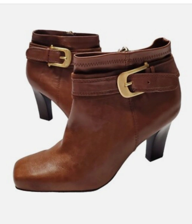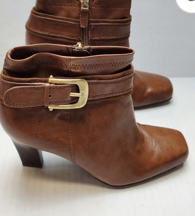 Step out in style with these used beautiful brown leather ankle boots, size 8. These boots feature a chic square toe and a comfortable block heel, perfect for adding a touch of sophistication to any outfit. The side zip closure ensures easy wear, while the decorative buckle adds a fashionable flair.