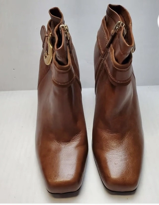 Step out in style with these used beautiful brown leather ankle boots, size 8. These boots feature a chic square toe and a comfortable block heel, perfect for adding a touch of sophistication to any outfit. The side zip closure ensures easy wear, while the decorative buckle adds a fashionable flair.