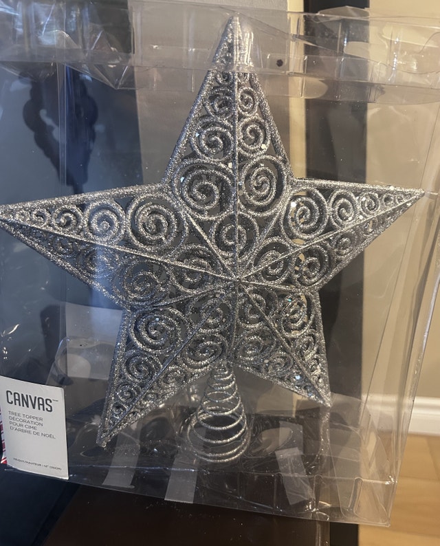Add a touch of sparkle to your Christmas tree with this Canvas tree topper. This star-shaped topper features a beautiful silver glitter finish and intricate swirl design. This item was used for one season to next to new, still in it's original packaging. Spruce up your tree with this topper. It really will stand out. Pick up in Springbank Hill Specifications: * Brand: Canvas * Shape: Star * Colour: Silver * Size: 12 inches If you're seeing this ad, the Christmas spirit must be telling you it's still available! Don't miss out—it's like finding a sprinkle of magic in your day!