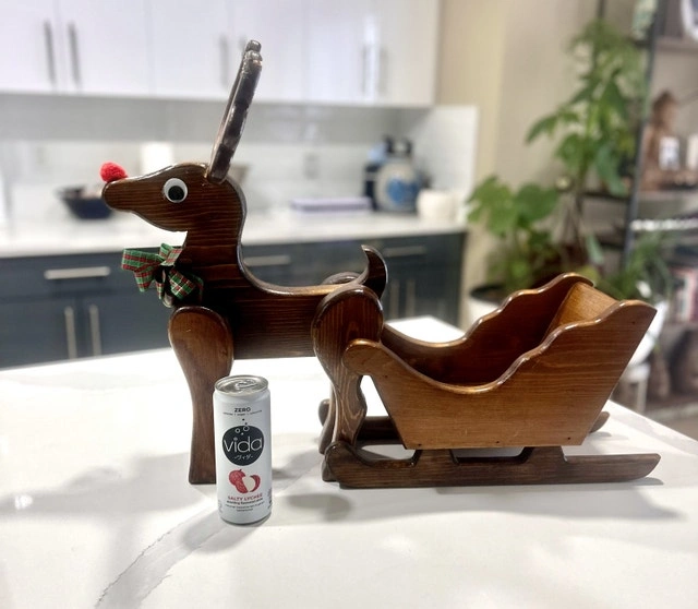 This charming used wooden reindeer and sleigh set brings a rustic touch to your holiday decor, perfect for adding a whimsical accent to any room. Featuring a cute reindeer with a red nose and festive ribbon, pulling a petite sleigh, it's ideal for displaying small treats or decorations. Please note, there is evidence of glue on one of the reindeer's ears (see photo), but it does not detract from the overall charm. Pick up in Springbank Hill.