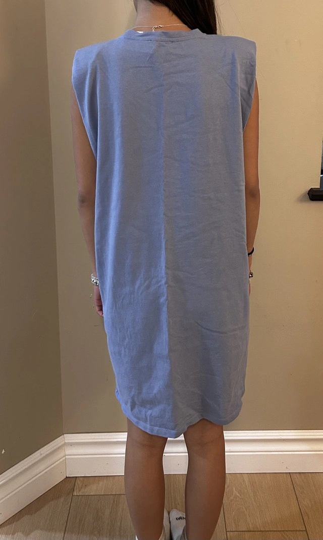 This is a super cute, new Zara sleeveless t-shirt dress with shoulder pads in a size medium. It’s perfect for the summer and travelling.