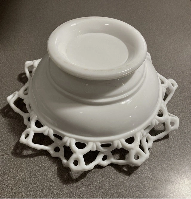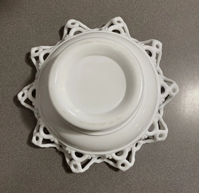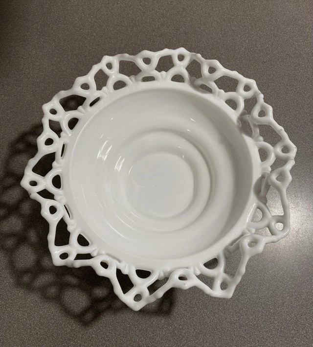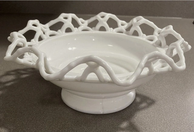 Add a touch of elegance to your home with this beautiful, vintage milk glass pedestal bowl featuring a delicate lace edge. This piece is in great, perfect for displaying fruits, desserts, or as a standalone decorative item. The intricate detailing and classic design make it a charming addition to any table setting or display cabinet. This pedestal bowl adds a touch of vintage charm, like finding a hidden treasure in Grandma's attic! If the ad is up, it's still available. Pick up in Springbank Hill or Royal Oak