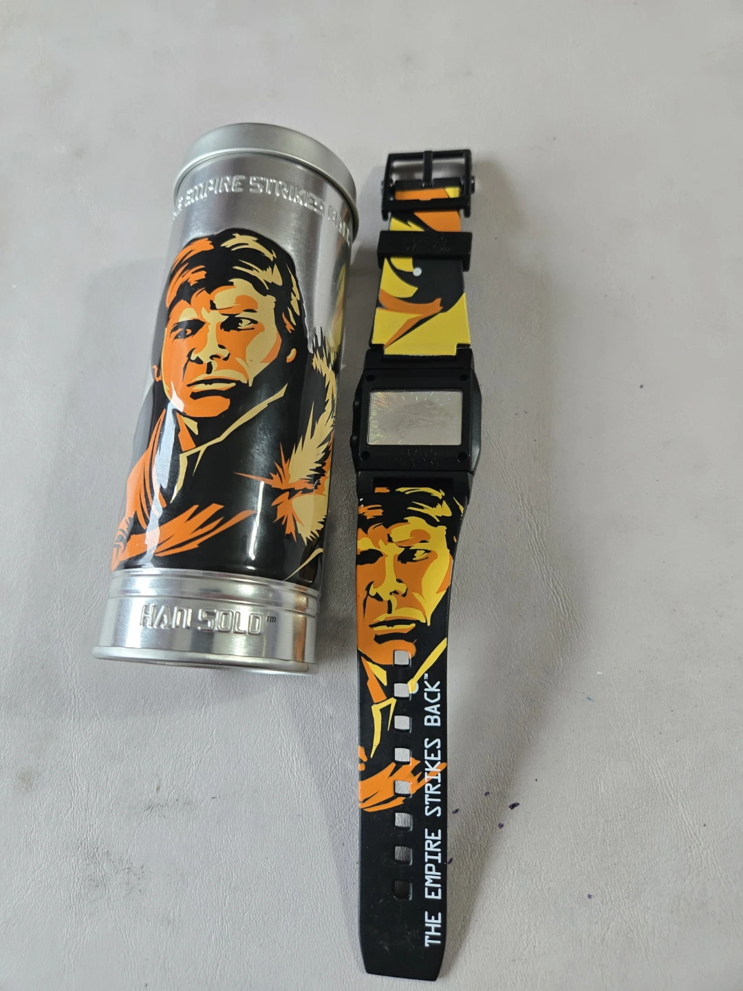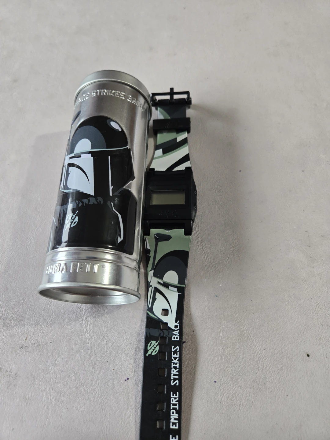 Selling Star Wars The Empire Strikes Back watch with original tin. One side features Han Solo and the other Boba Fett. Great for any Star Wars fan!