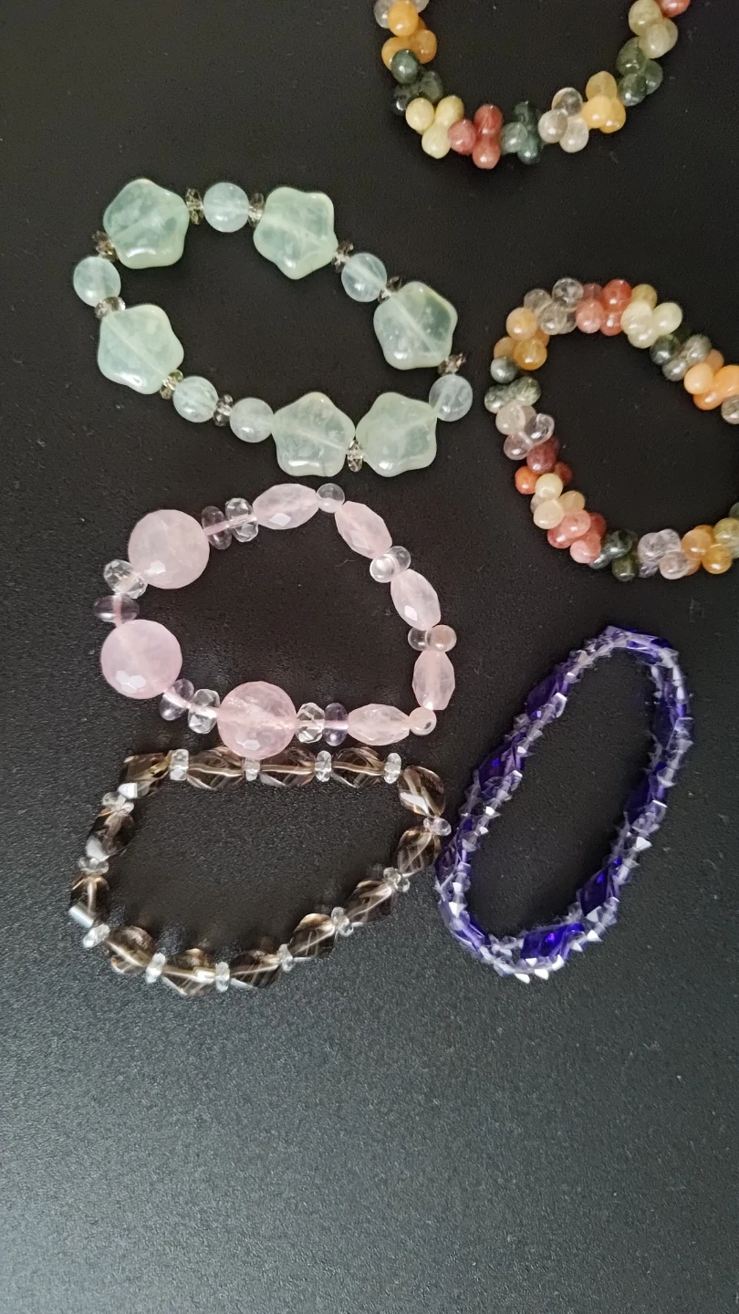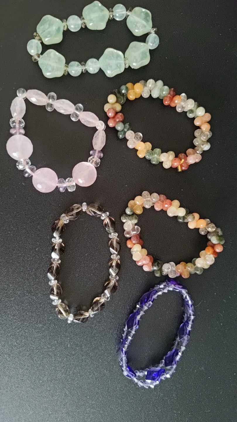 Here are some colourful gemstone beaded bracelets! There's a variety of colours and styles to choose from. They're all in excellent condition.