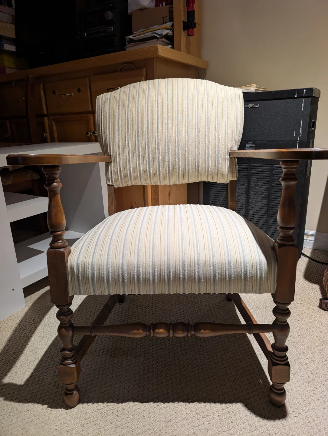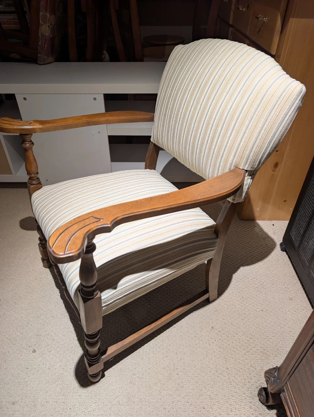 Selling a lovely vintage armchair! It features a striped fabric seat and back, with wooden armrests and legs. It's in great condition and would be a charming addition to any room