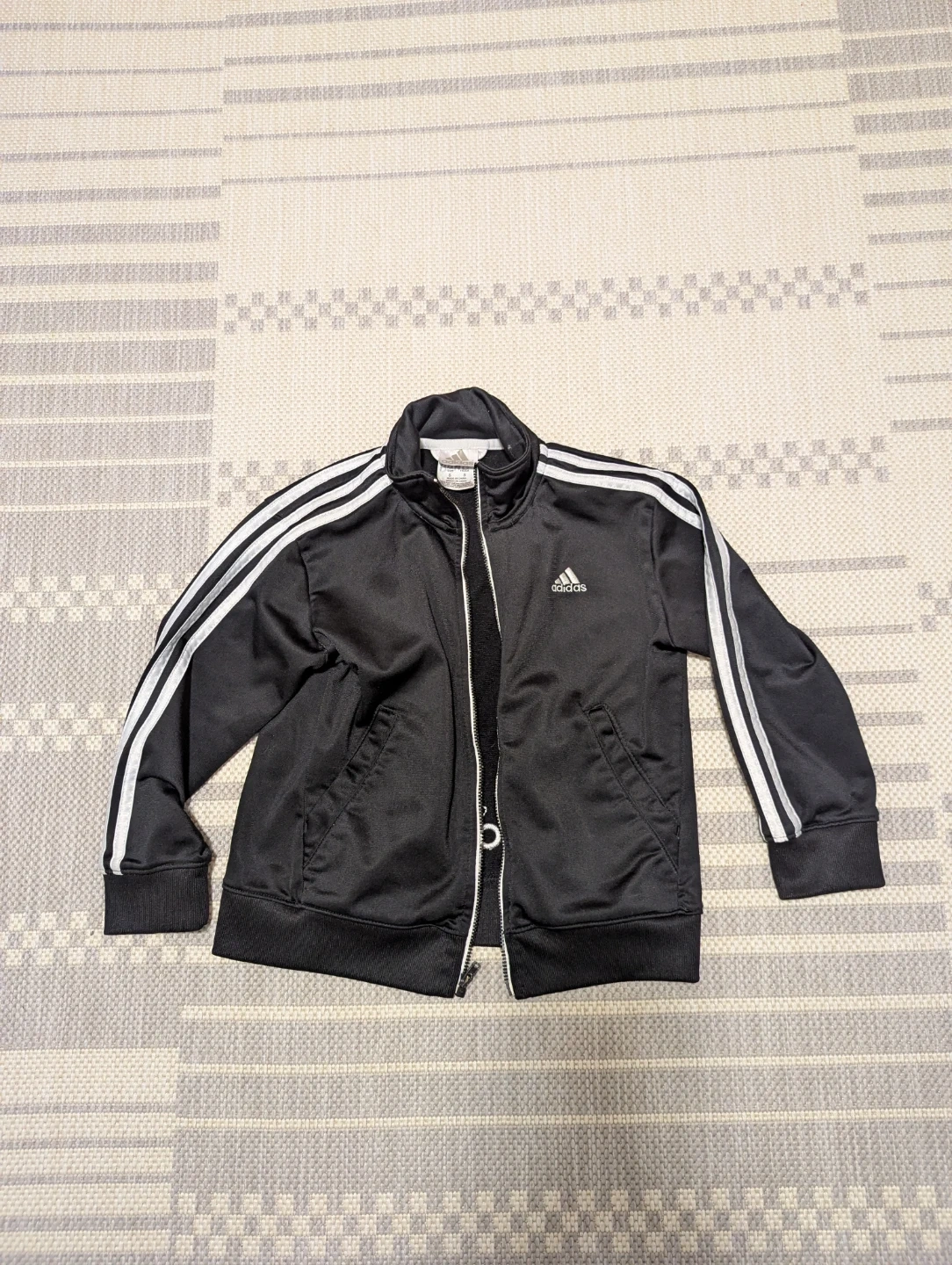 Selling a classic Adidas track jacket in black! It features the iconic three stripes on the sleeves and the Adidas logo. Perfect for workouts or casual wear!