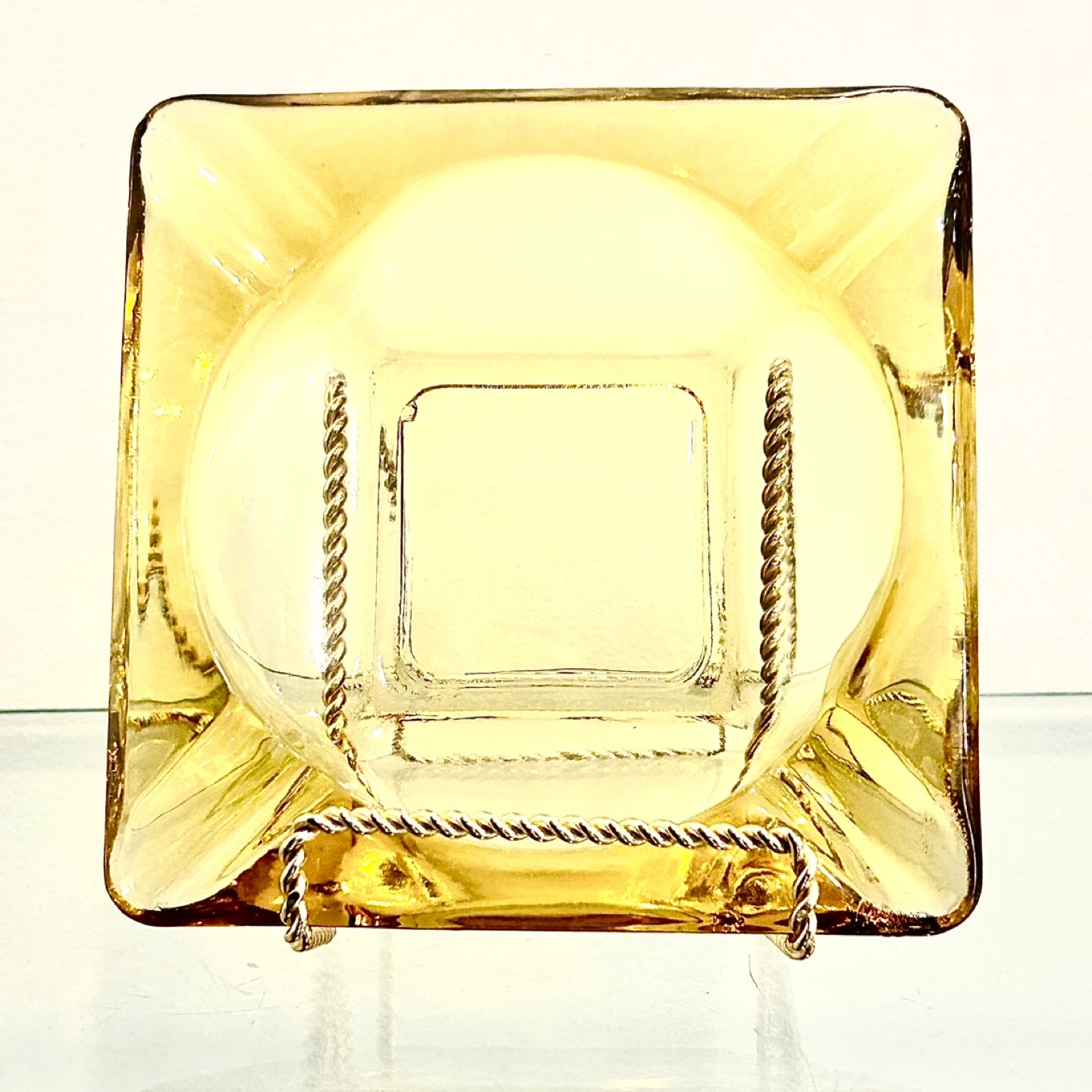 The form is architectural and intentional: a thick, square outer profile with softly radiused corners, framing a raised oval basin and a deeply molded base. The glass transitions from warm honey-amber to lighter golden tones depending on light angle, with internal optical distortions consistent with thick, hand-worked art glass rather than pressed or mass-produced wares.