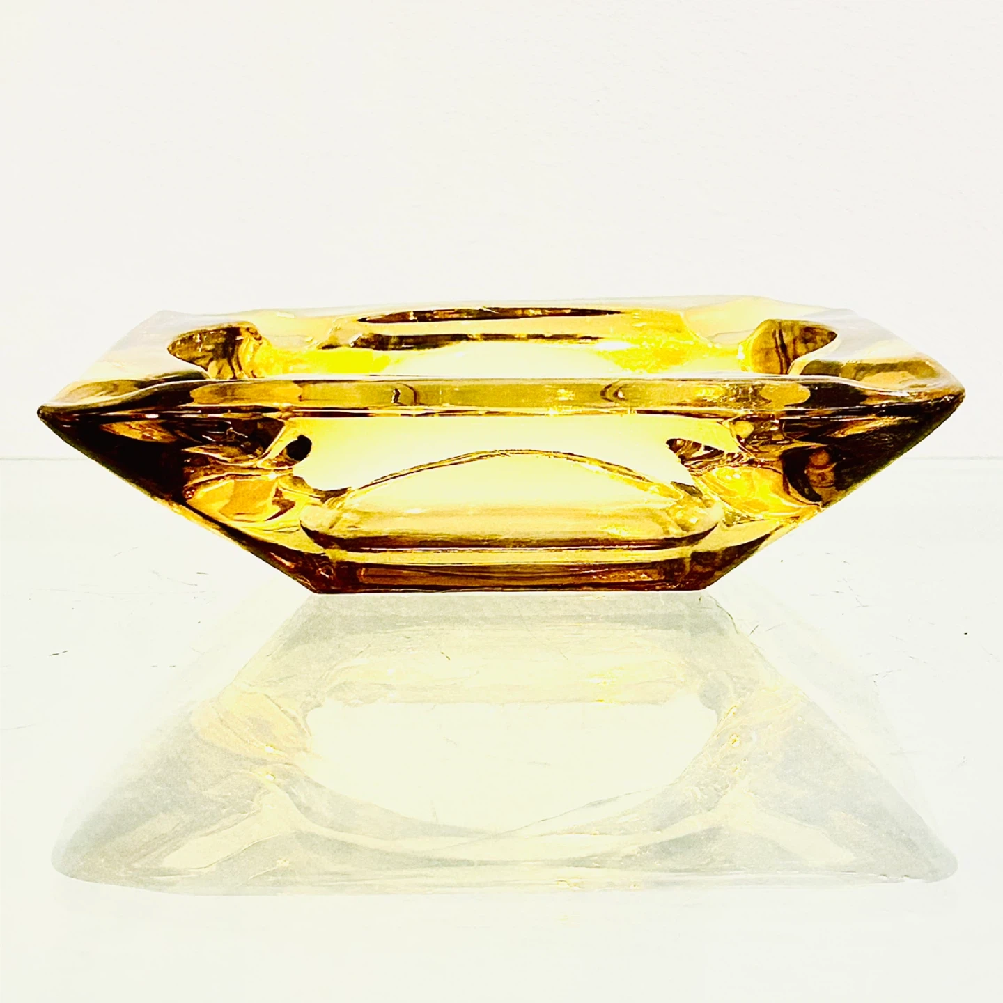 Likely produced in the 1950s-1960s, this exceptionally heavy amber art glass bowl exemplifies the modernist European glass movement of the mid-century period. The form is architectural and deliberate: a thick square outer frame with softened corners surrounding a raised oval basin, executed in richly saturated amber glass with strong optical depth.