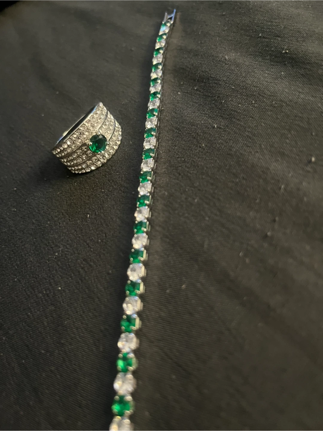 The ring has a wide band style, and the bracelet is a tennis bracelet with alternating green and clear stones. They would be a perfect addition to your jewelry collection or a nice gift!