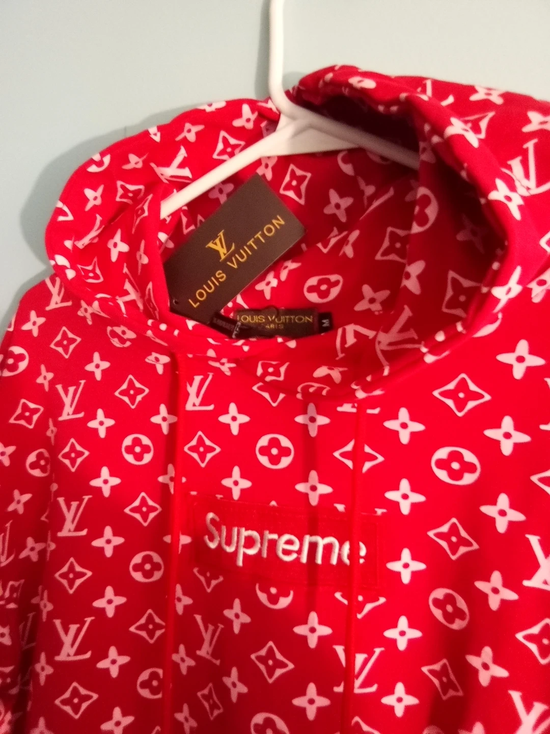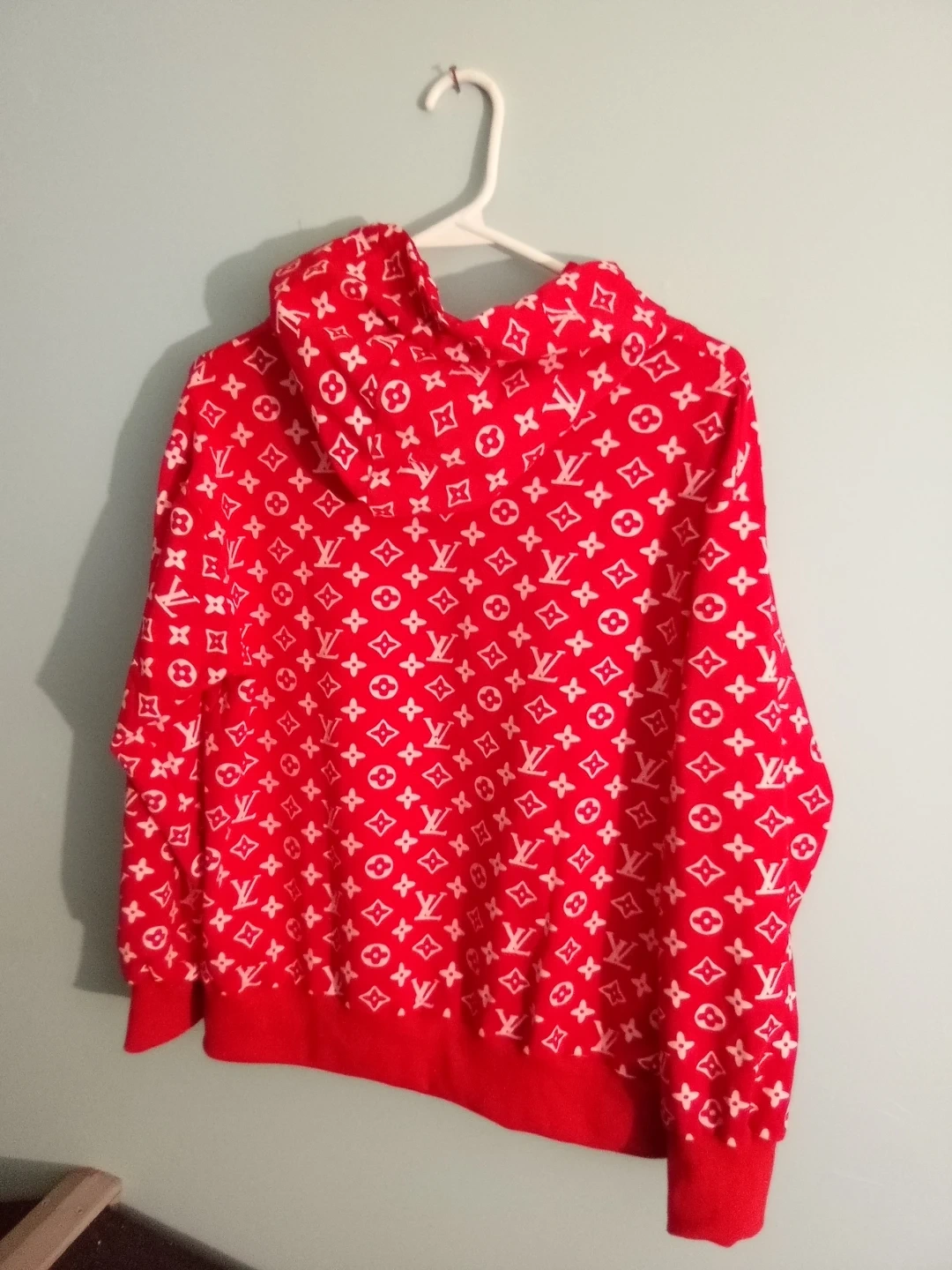 Selling a red Louis Vuitton x Supreme hoodie! The hoodie features the iconic Louis Vuitton monogram pattern with the Supreme logo. It's in great condition and ready for a new home!