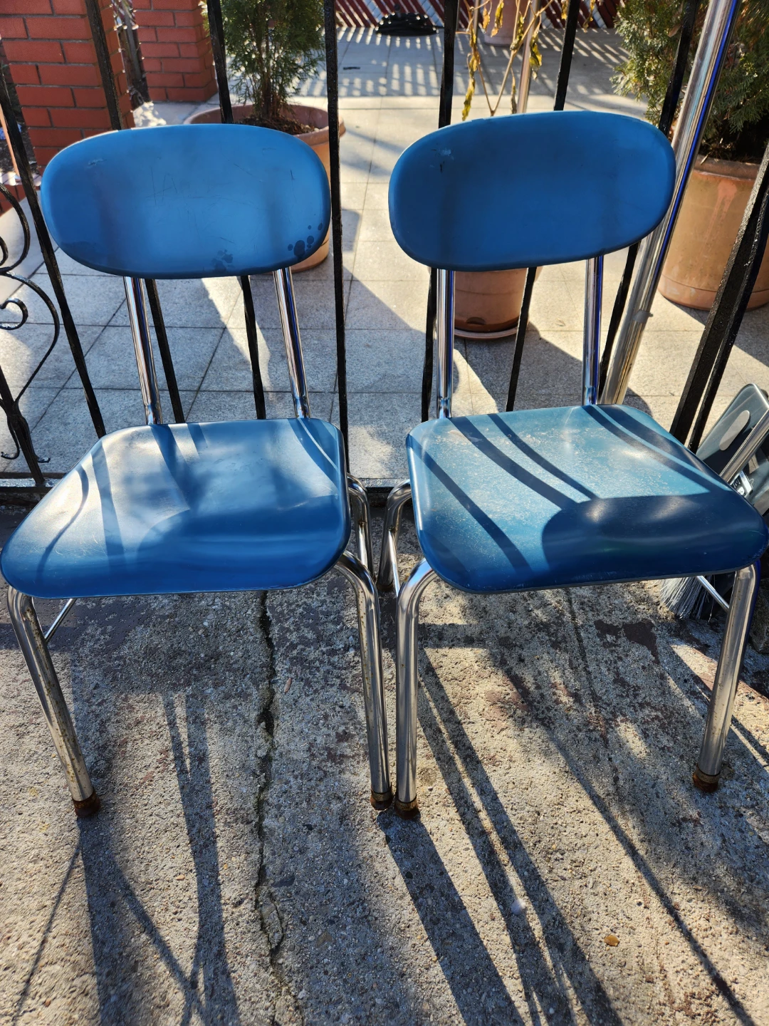 Selling a set of two vintage blue chairs. They have a classic design with chrome legs and a vibrant blue color. Perfect for adding a retro touch to your home!