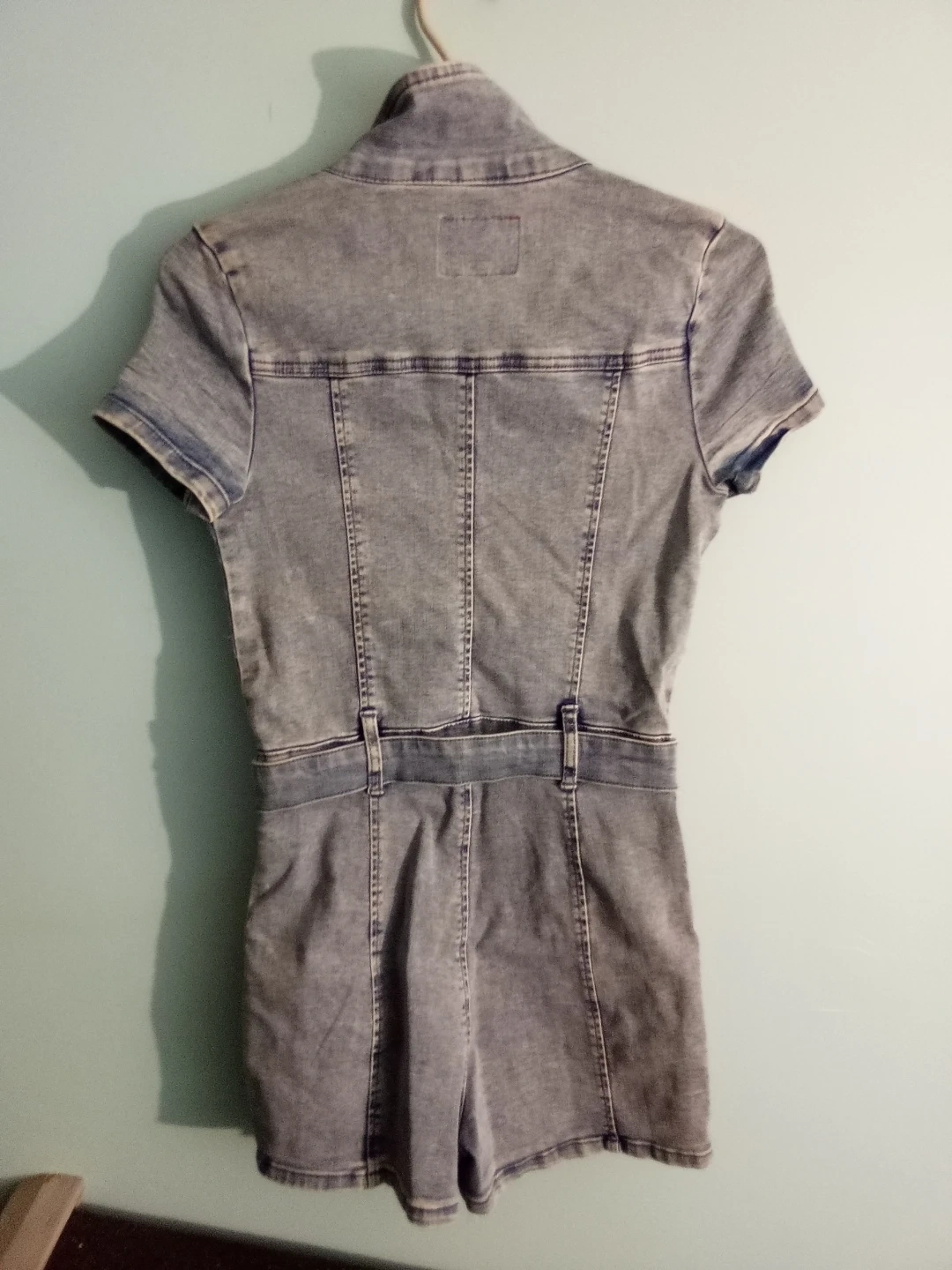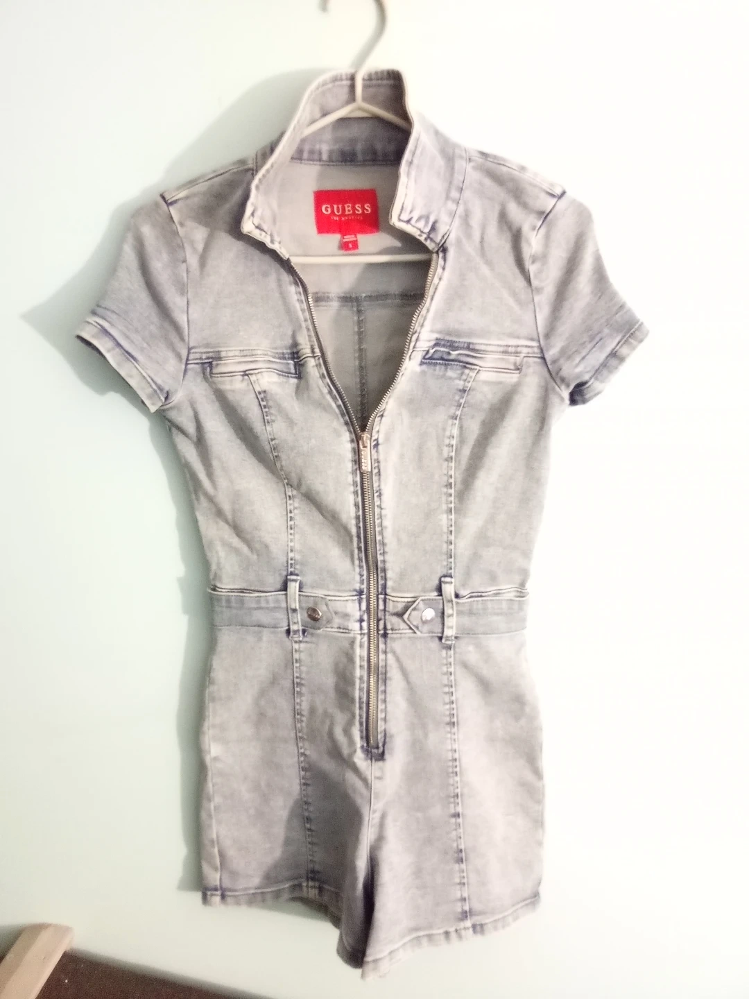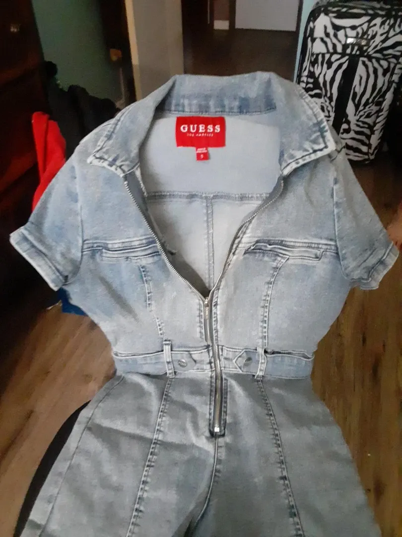 Selling a cute Guess denim jumpsuit in size small! It's in great condition and features a zip-up front. Perfect for a casual day out or a fun night with friends