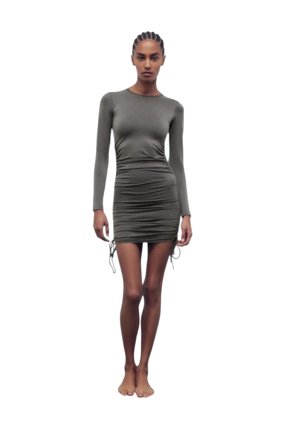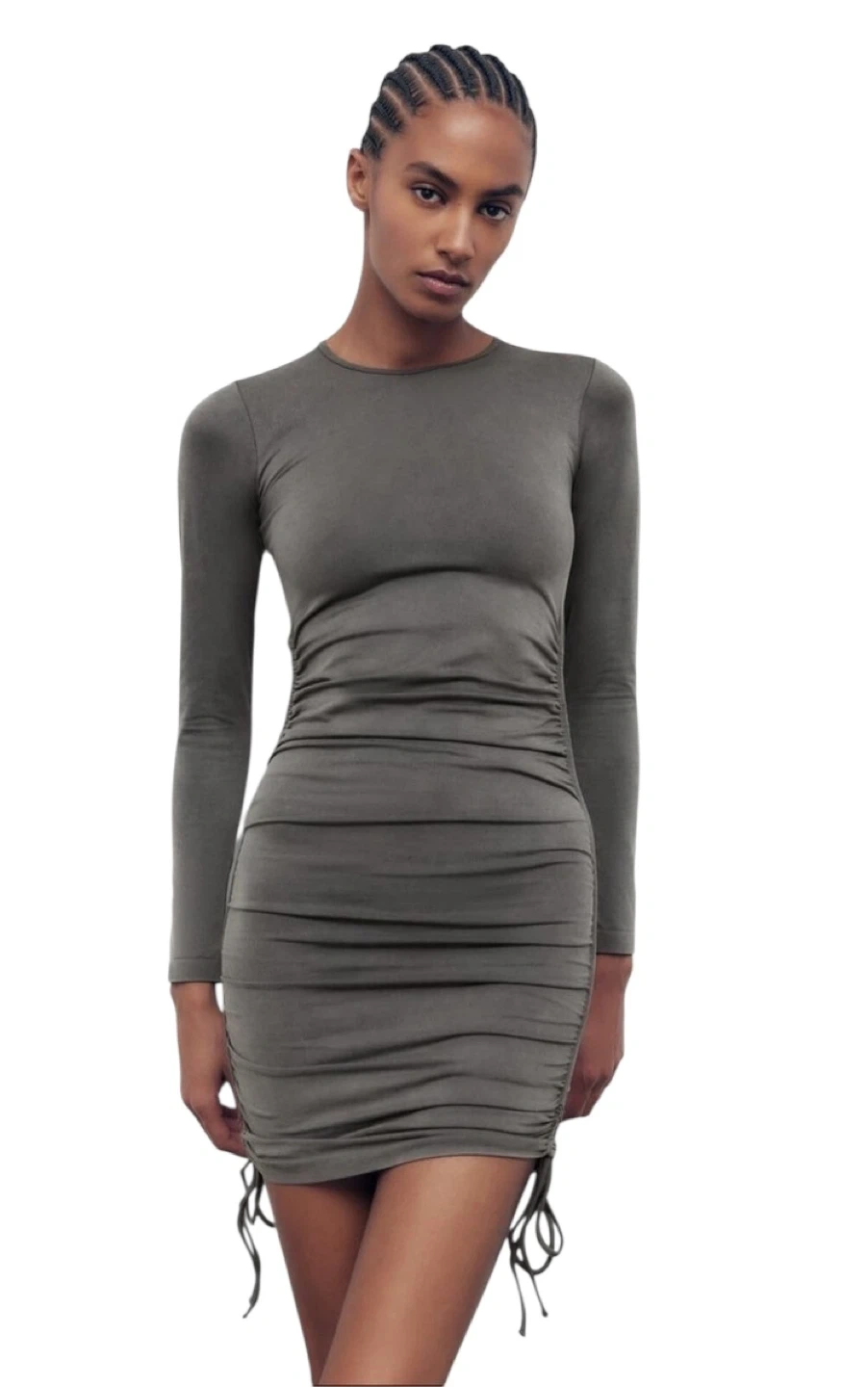 This gray dress features a sleek design with long sleeves, perfect for any occasion. Its sophisticated style offers a flattering fit. drawstrings on both side sides for a ruched effect.