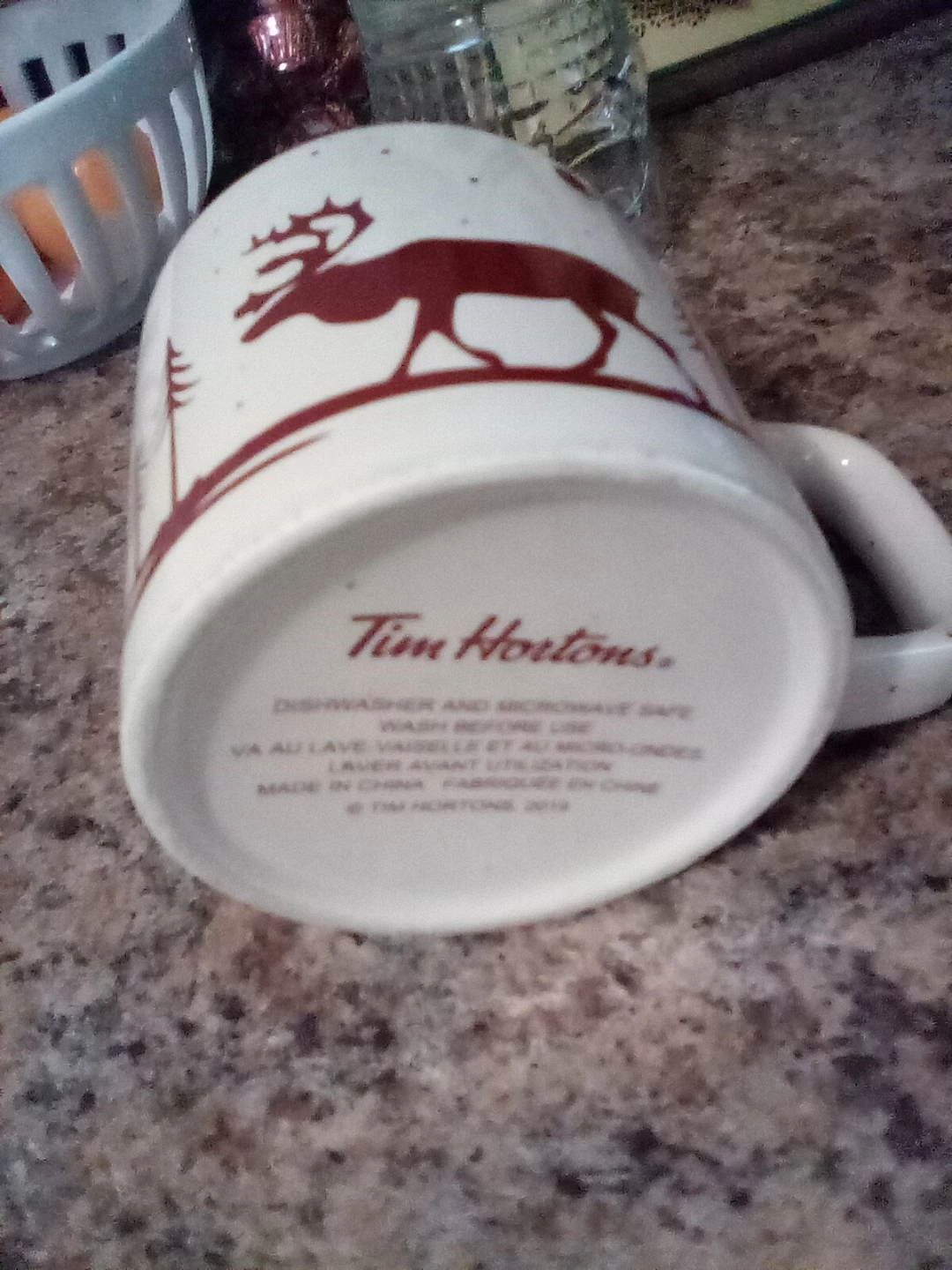 Tim Hortons mug with a moose and pine tree design.Almost new.