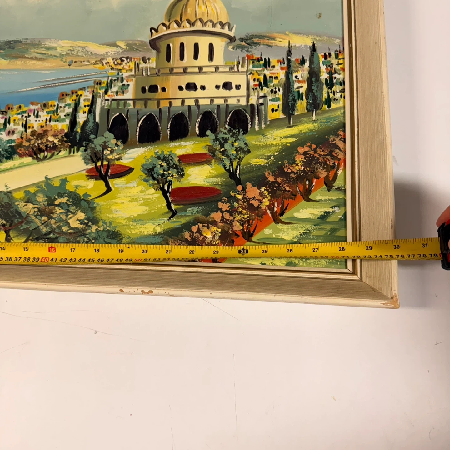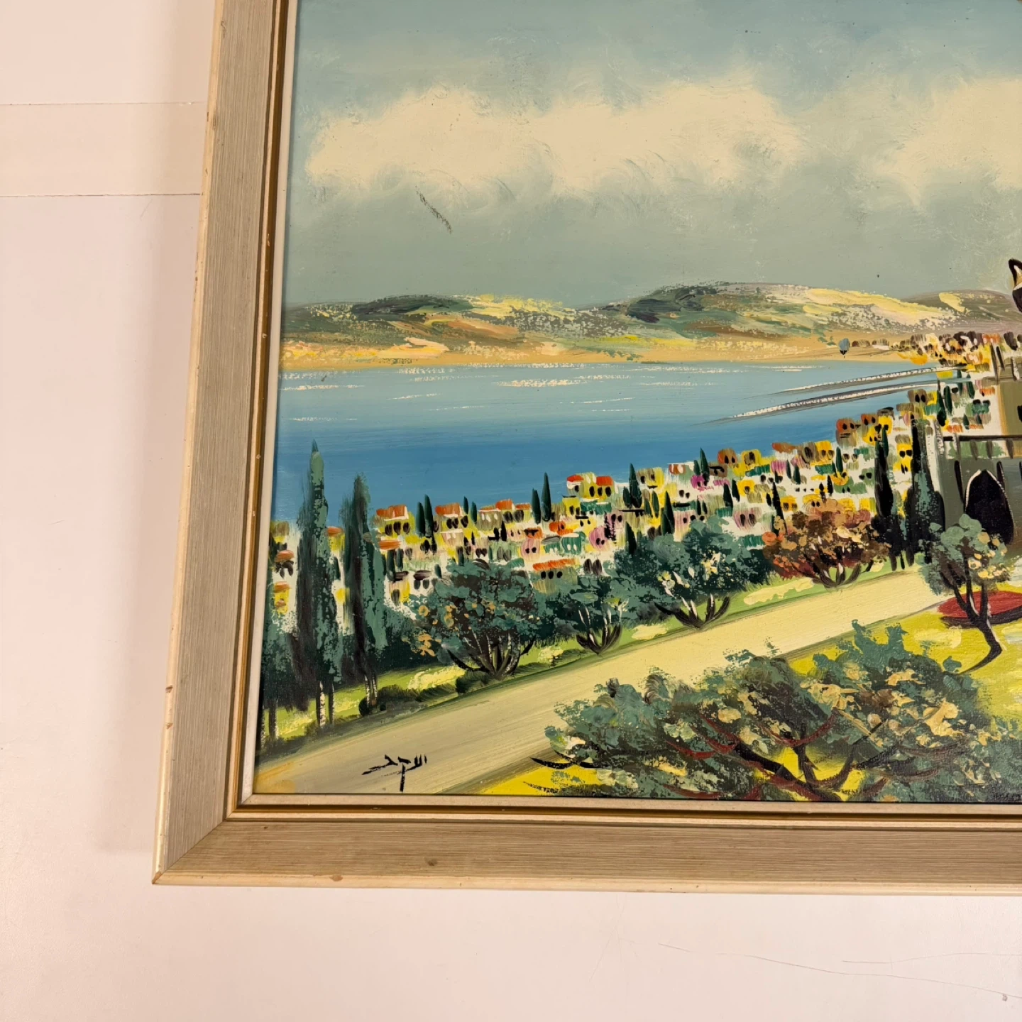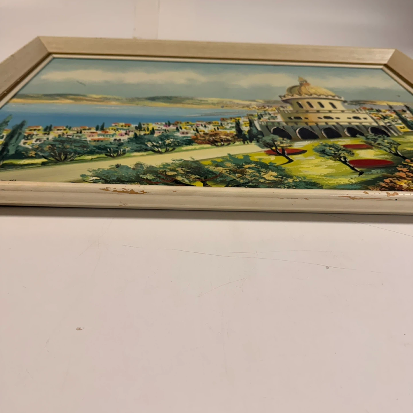 Original vintage hand-painted landscape artwork featuring a Mediterranean coastal city with a domed building, trees, and hillside scenery.