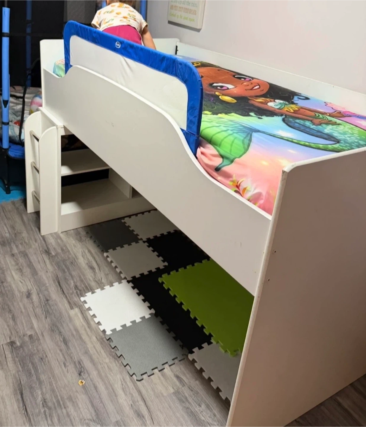 Selling a cute white loft bed for kids! It's in great shape and has handy storage built in underneath. Perfect for saving space in a smaller room and adding a fun touch to any kid's bedroom