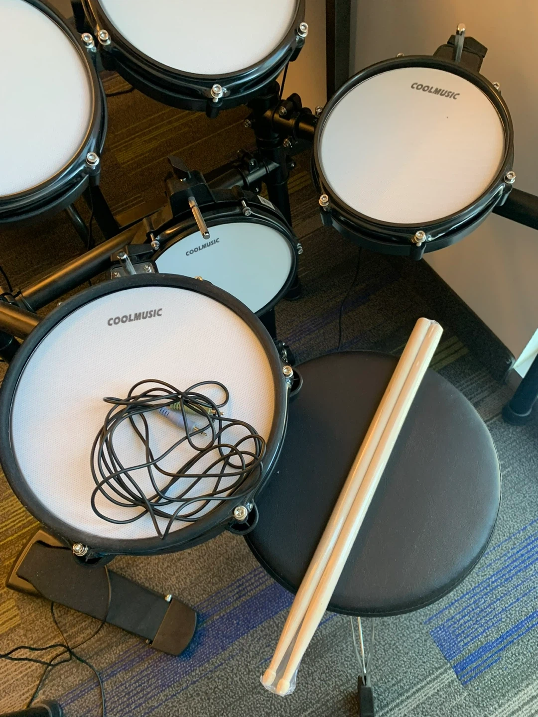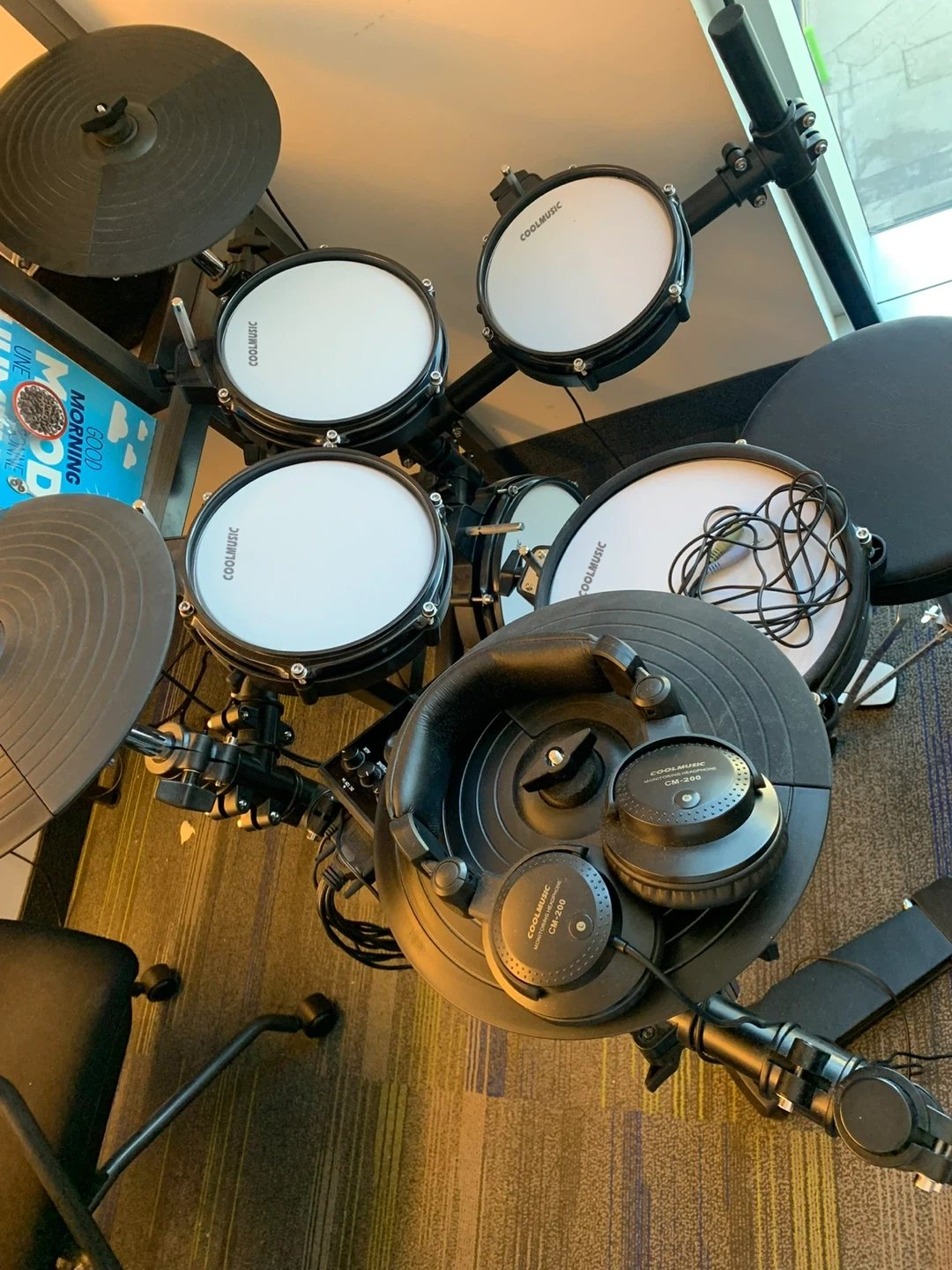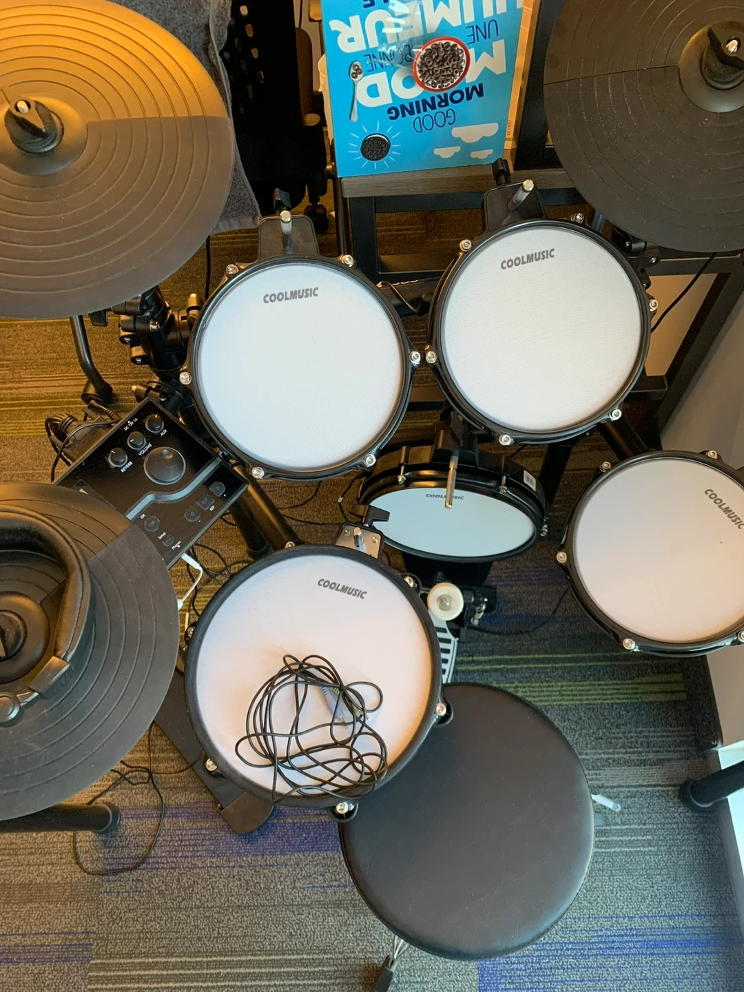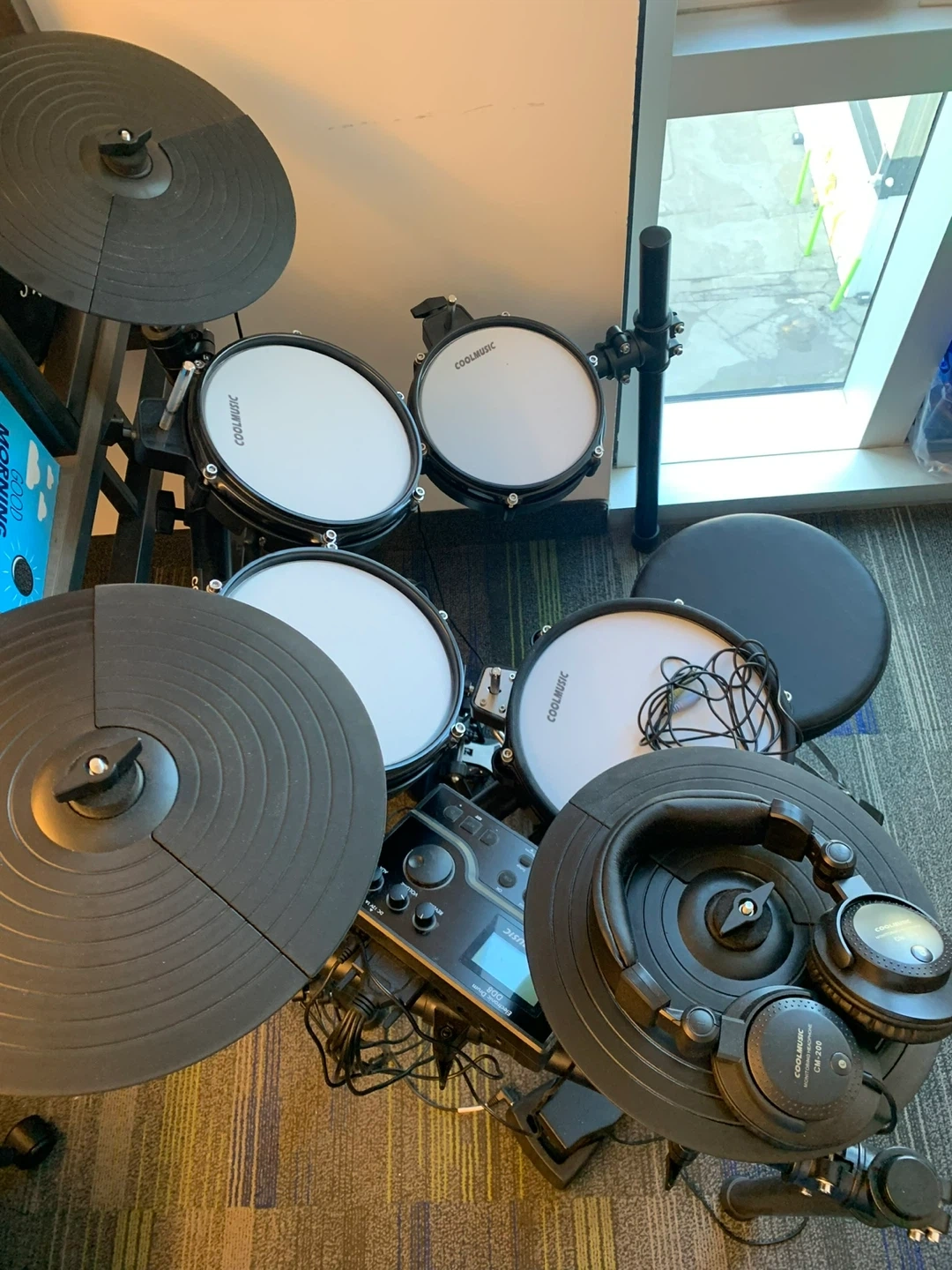 Selling a Coolmusic electronic drum set. It comes with everything you see in the pictures, including the drum pads, cymbals, headphones (Coolmusic CB-200), stool, and foot pedal. Great for beginners or anyone looking for a quiet practice solution!