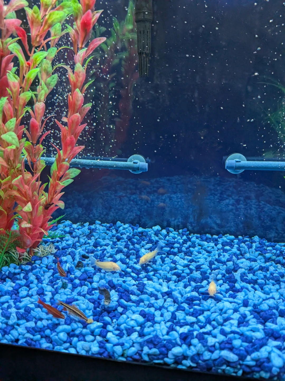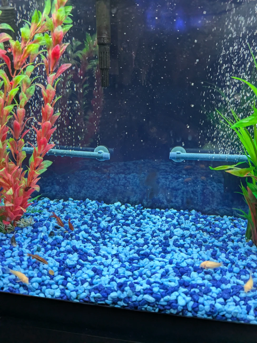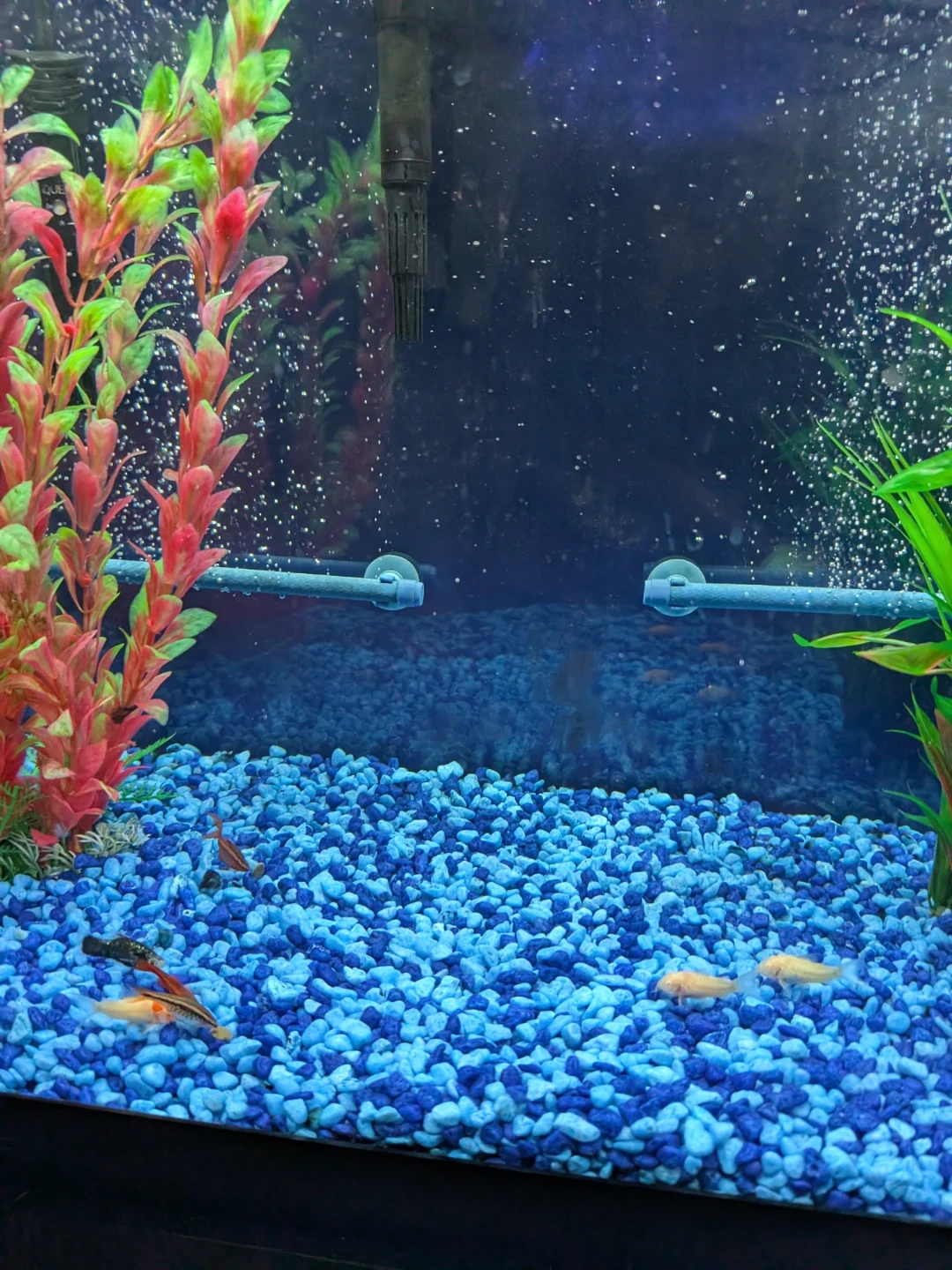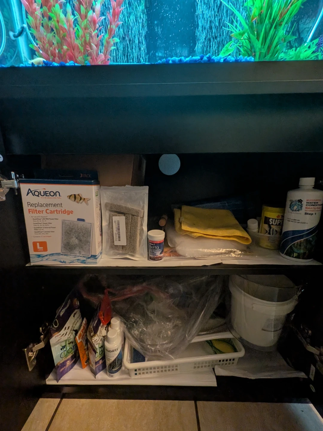 29 gallon Fish Tank with black cabinet and fish for sale. Blue Rocks in the fish tank and everything in the cabinet you can see in the pictures comes with it as well. Located in Brantford.