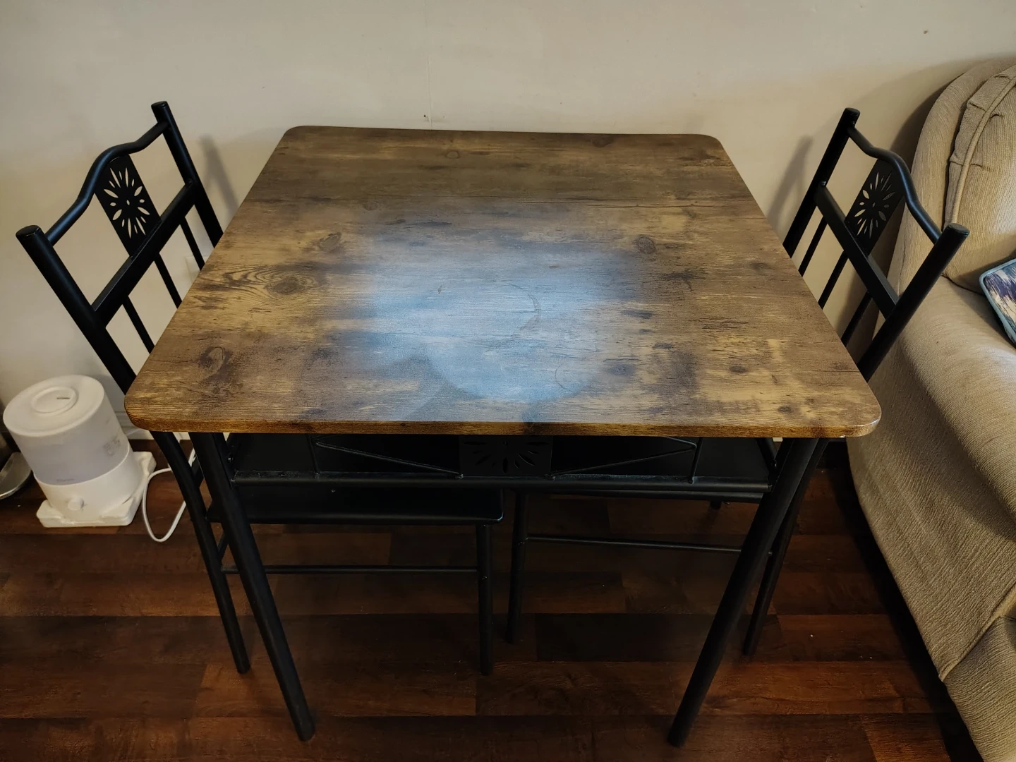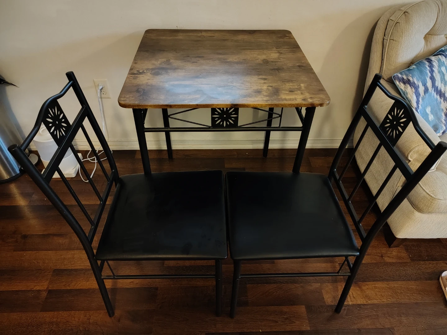 Selling a small square dining table that comes with two chairs. Perfect for small spaces or apartment living. The table has a wood-look top and black metal legs. The chairs have black seats and decorative backs. Great for a cozy dining nook!