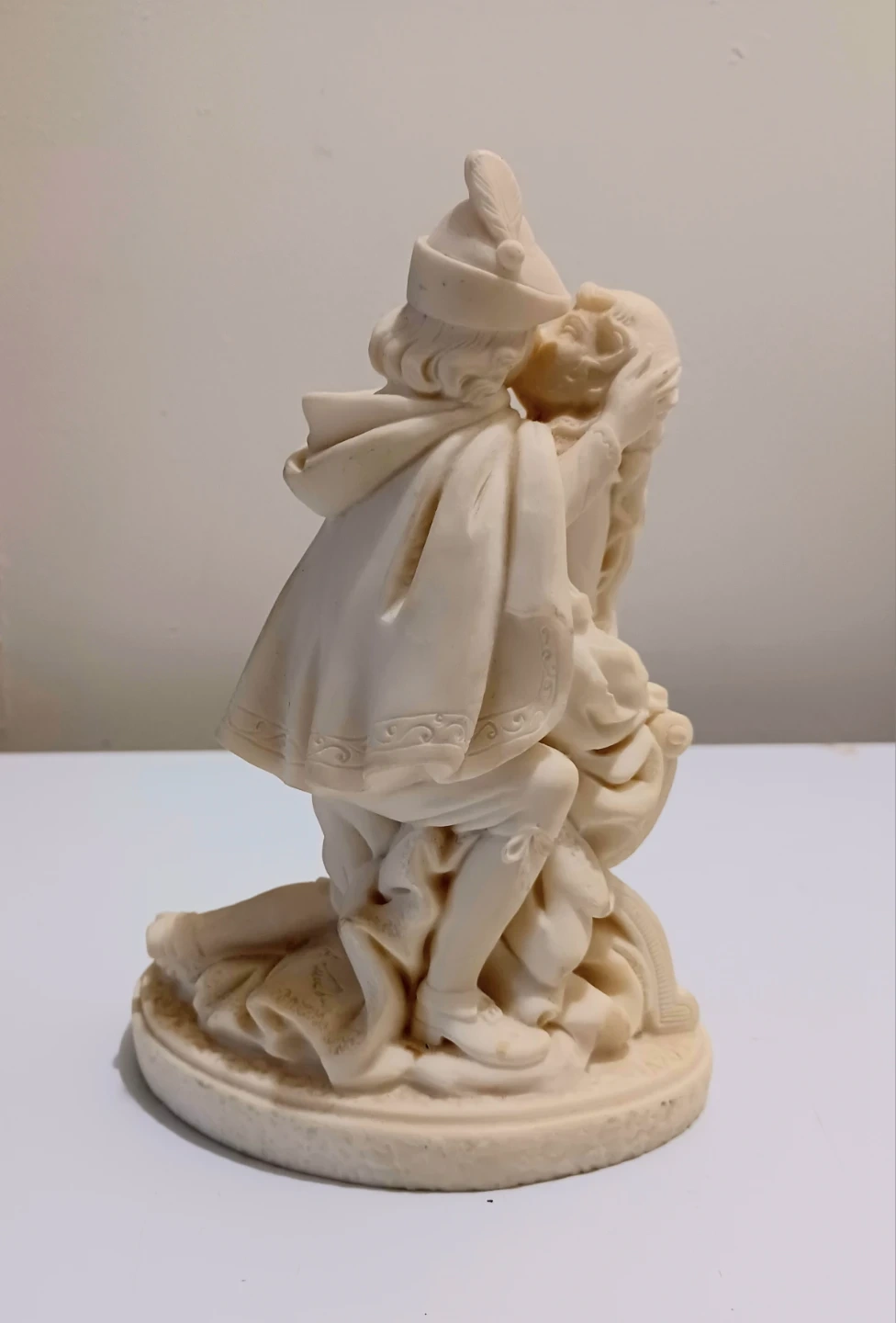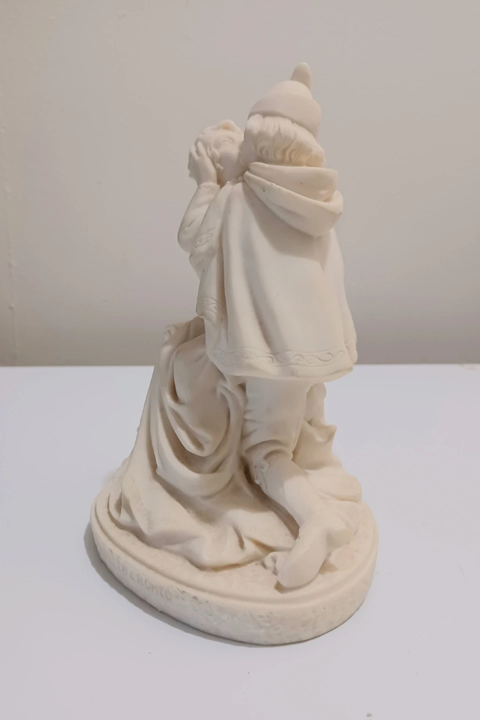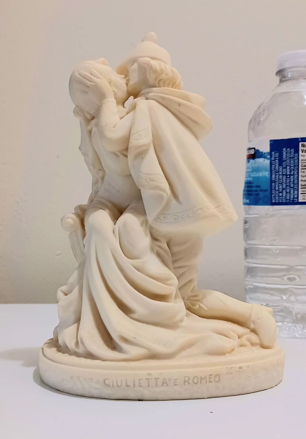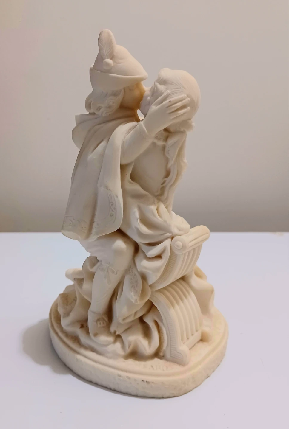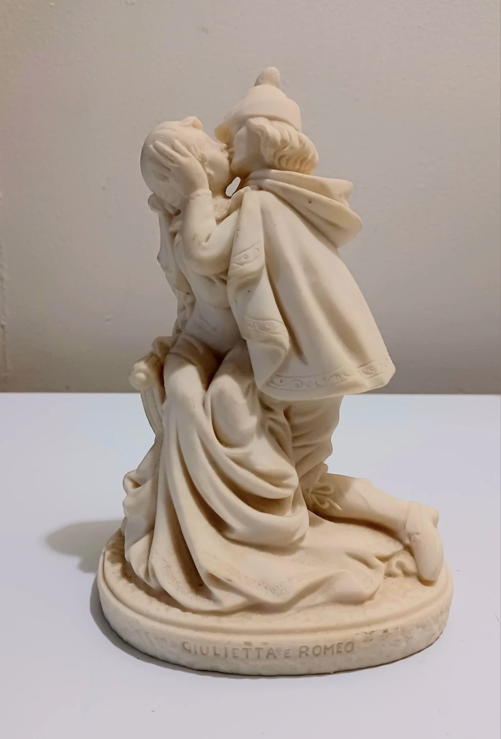 This Exquisite, Signed A. Lucchesi FARO Sculpture is Italian Hand-carved from Alabaster, showcasing Intricate Details and artistic Craftsmanship. This beautiful piece depicts a romantic couple Romeo and Juliet embracing.