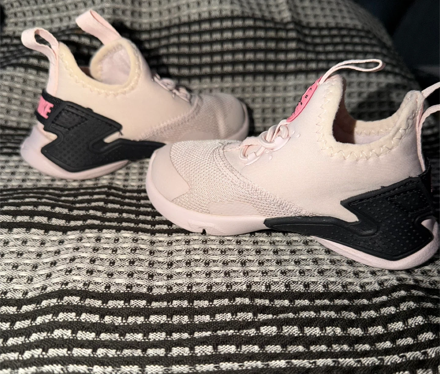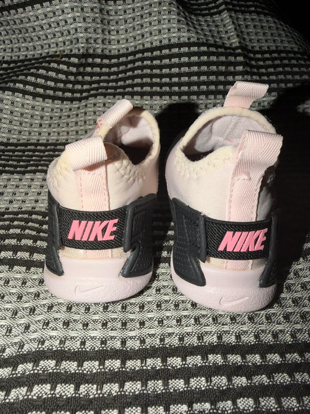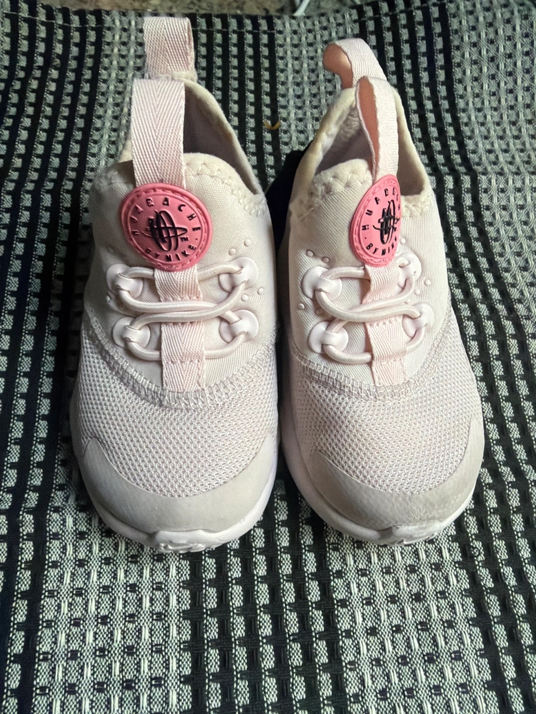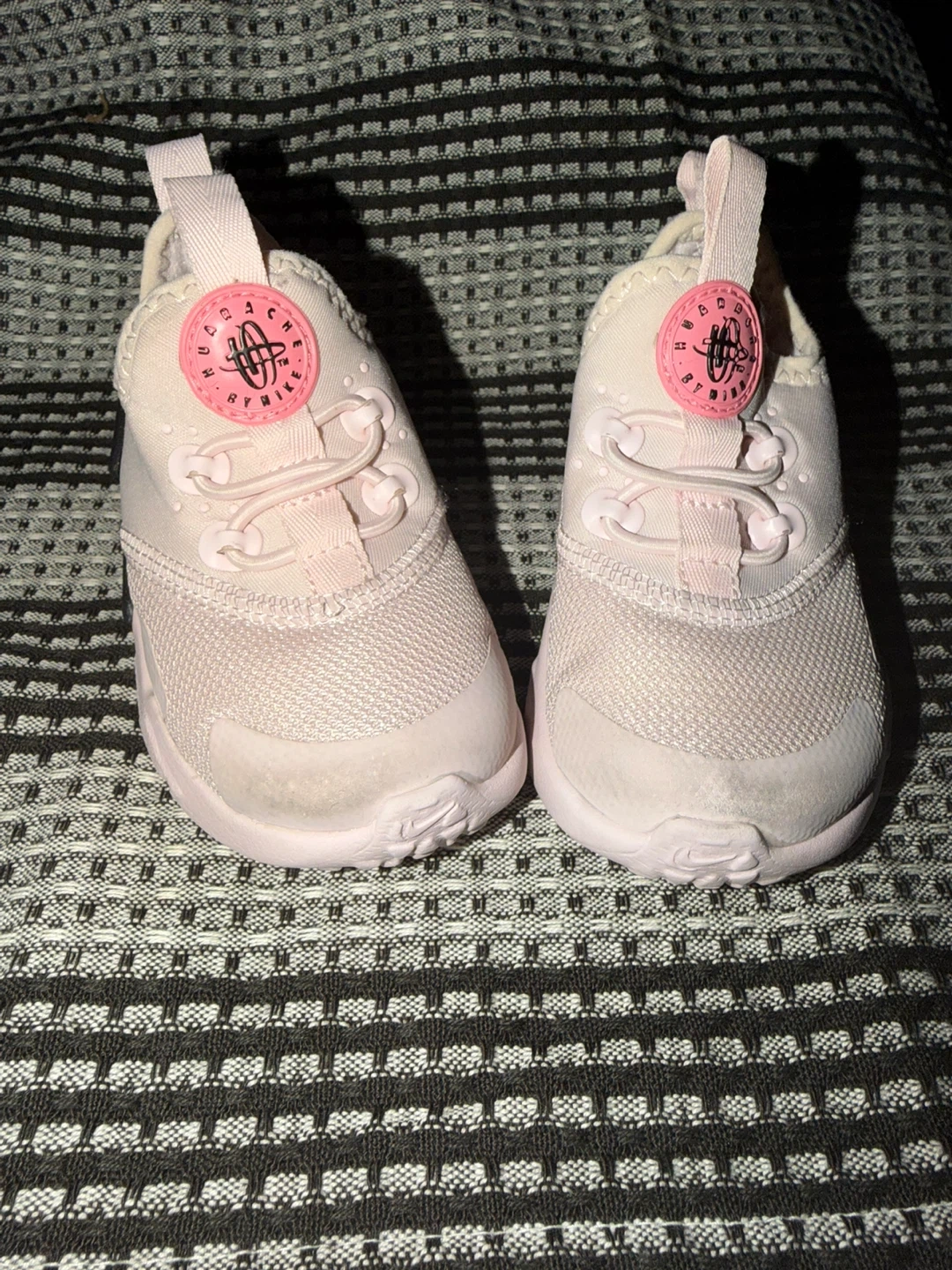 Selling a pair of baby Nike Huarache shoes in pink. They're in good condition and have a cute design on the front and the Nike logo on the back. Side 5C.