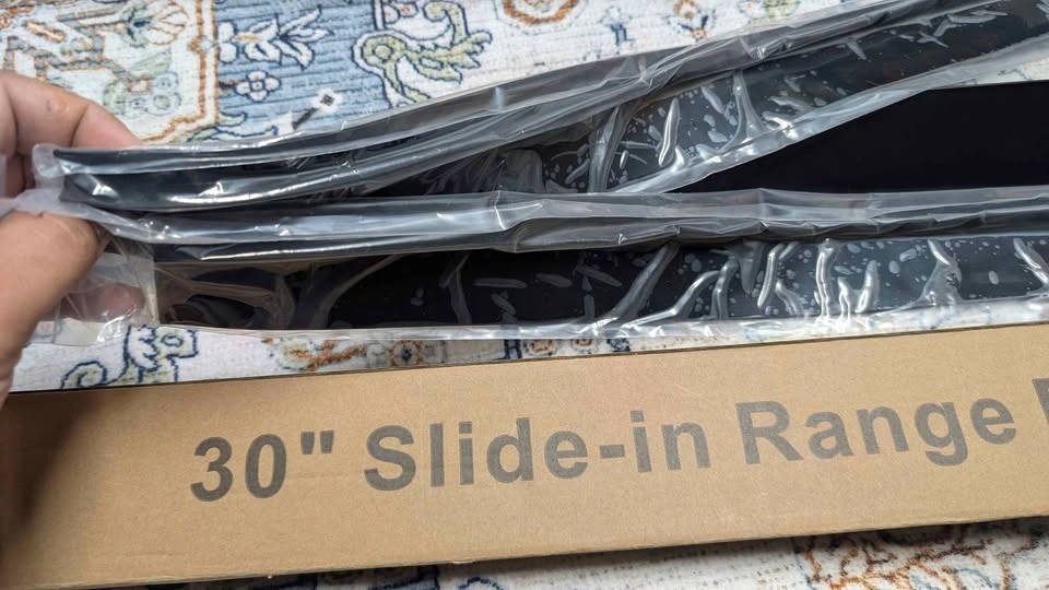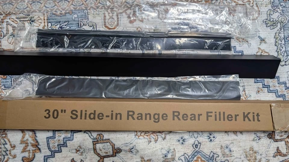 Brand New Slide-in range rear filler kit ( stainless steel black section+ 2 PC black rubber strips). Great for filling that annoying space between wall and countertops, Owens etc