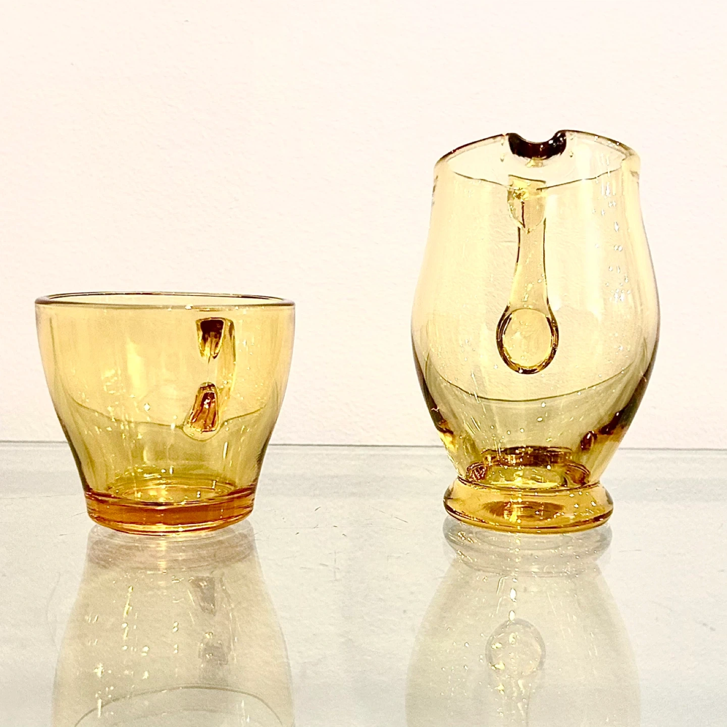 These read as mid-century / studio-style amber glass, ideal for collectors of MCM barware/serving pieces, art glass, or unusual cream & sugar alternatives. The heft and applied handle work present well on a bar cart, display shelf, or alongside vintage trays and cocktail accessories.