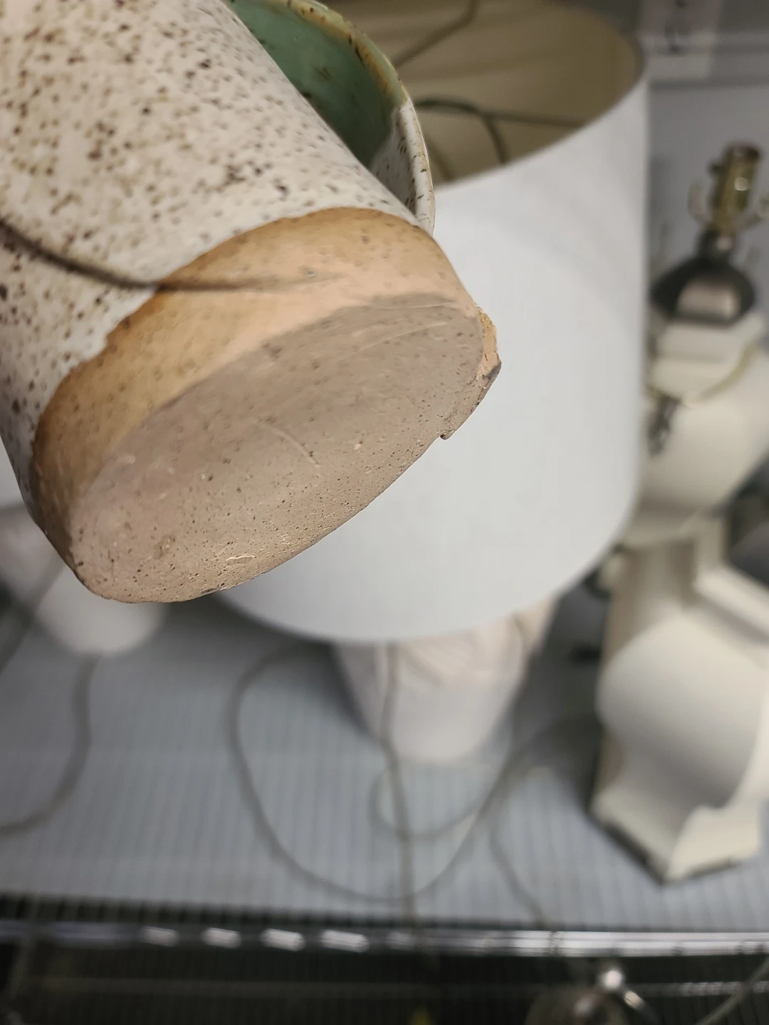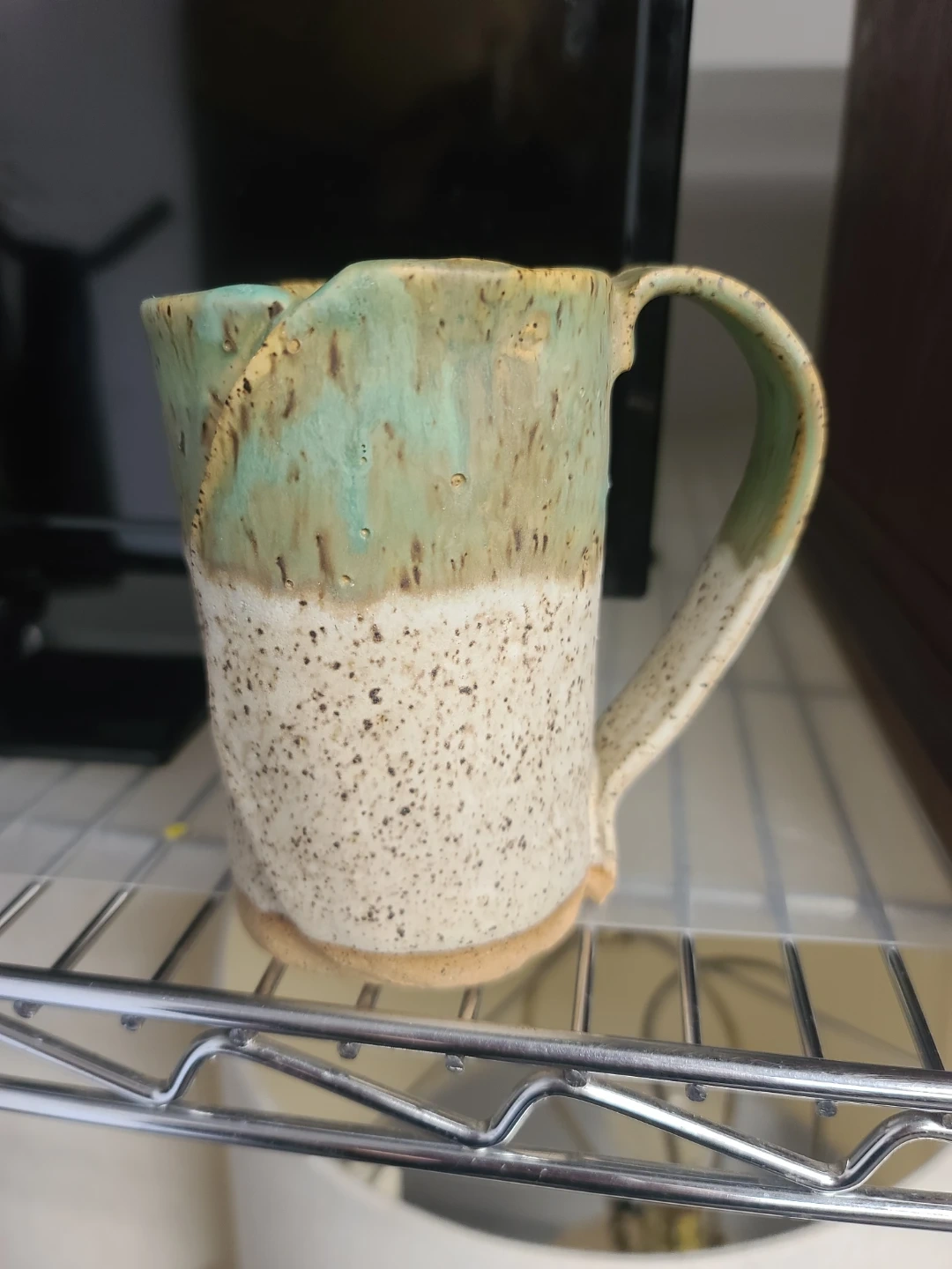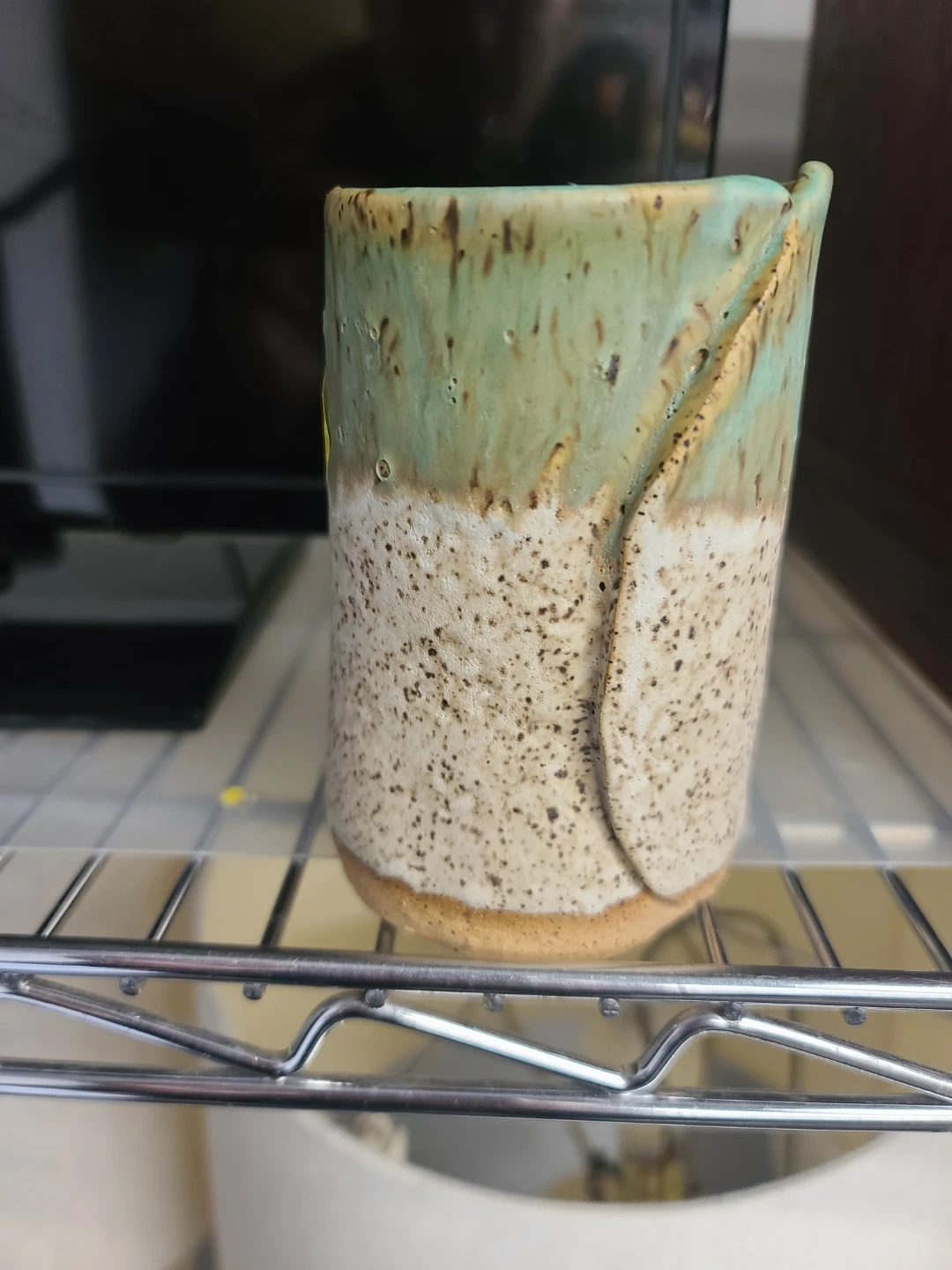 Selling a unique handmade ceramic mug! It features a lovely combination of green and beige colors, with a speckled pattern on the lower half. Perfect for enjoying your favorite hot beverage