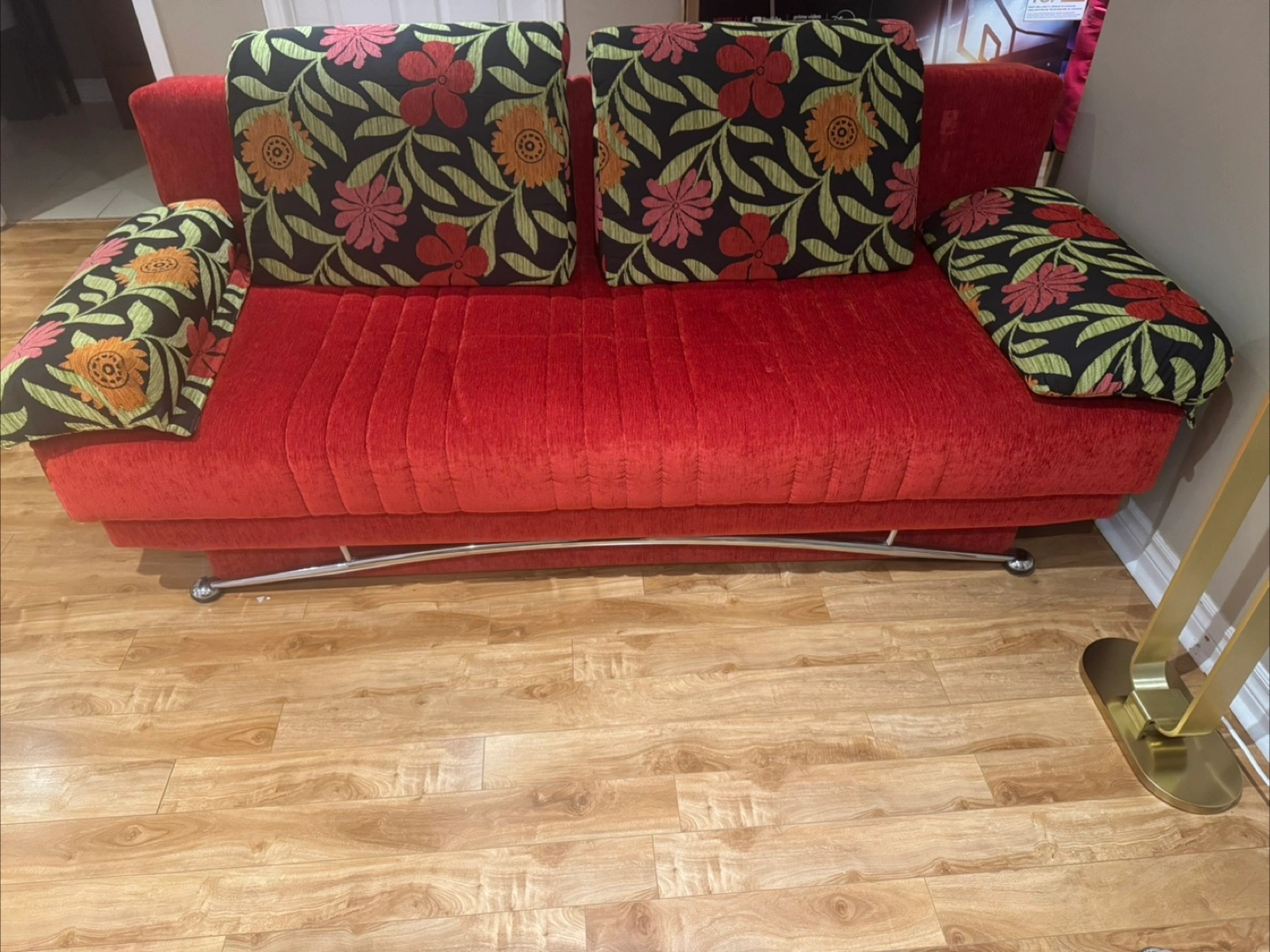 Red Futon with Floral Pillows