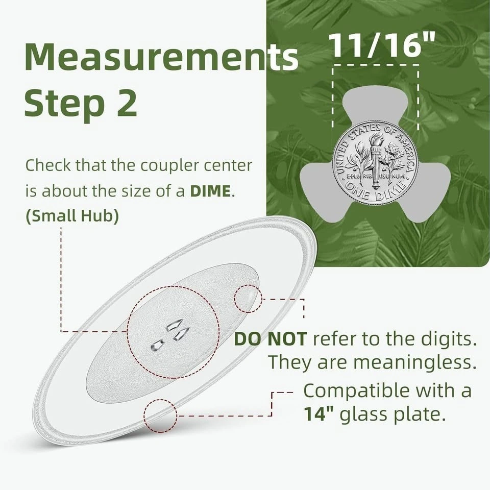 This 14 IN Microwave Glass Turntable has a one-dime sized small coupler hole in the center. The center spot of the microwave oven plate coupler measures 11/16" in diameter. The Roller Ring's rotation diameter should between 8 5/8" and 12 3/4".