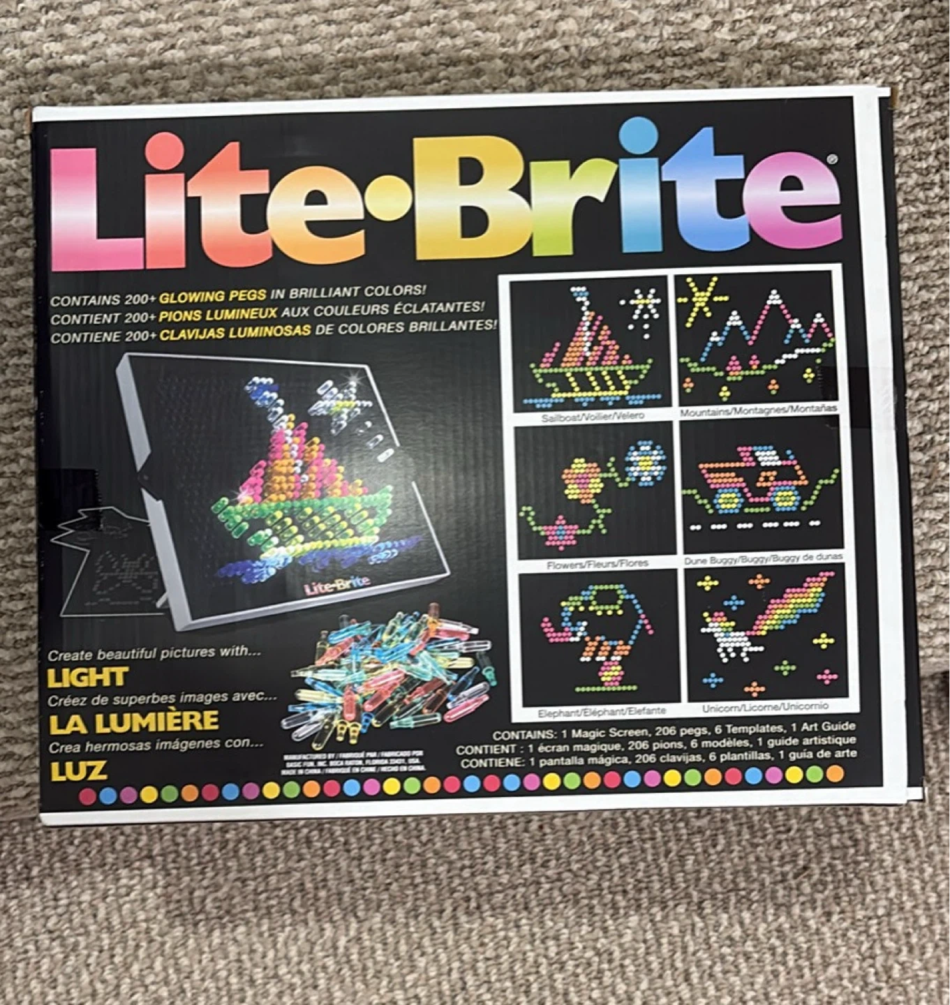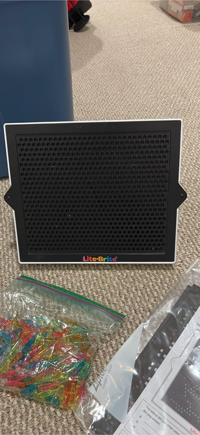 Lite-Brite set that’s is battery operated which makes it mobile. Comes with the magic screen, pegs, templates, and an art guide. Create beautiful pictures with light!