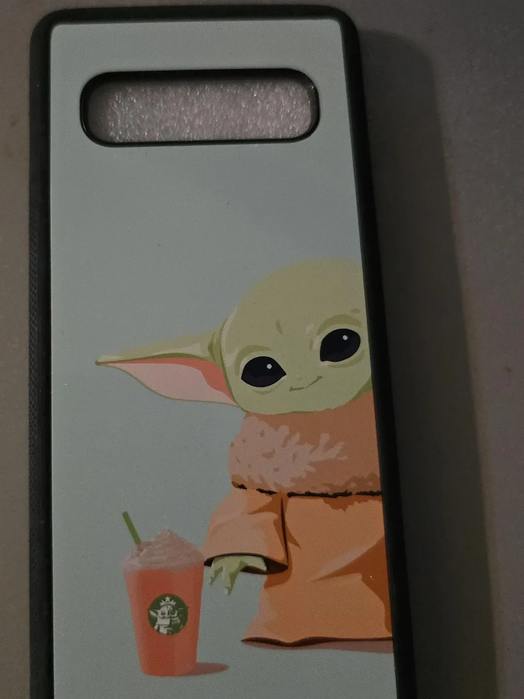 Here's a fun phone case for a Samsung Galaxy S10 plus! It features Baby Yoda (Grogu) enjoying a Starbucks drink. It's in great shape and ready for a new phone!