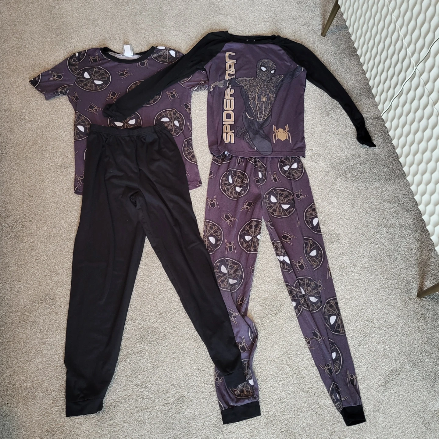 Two Spider-Man pajama sets. One is a short-sleeved shirt with long pants, and the other is a long-sleeved shirt with long pants. Both are in great condition and ready for a new Spider-Man fan