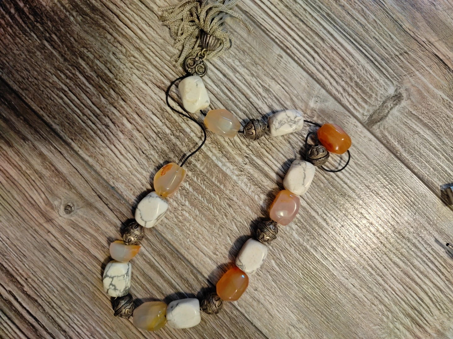 Beautiful beaded worries beans featuring orange and white stones. The beads are strung on a black cord and accented with metallic details. Made out of real marble. I have more worry beans from Greece that I won't list here.