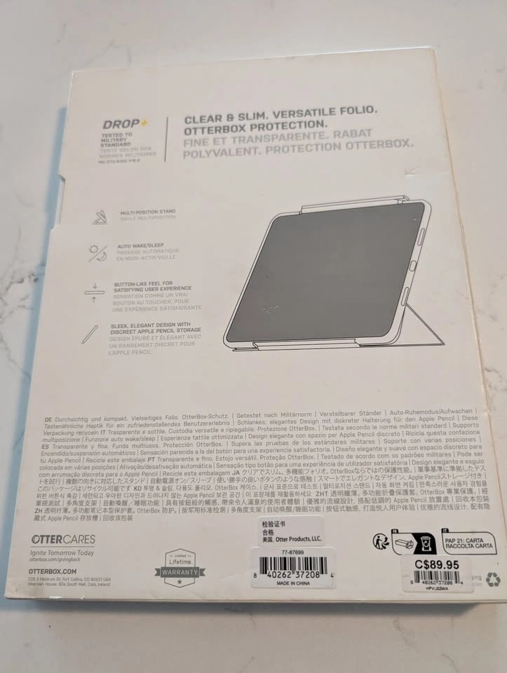 Military-grade drop protection keeps your device safe from falls and bumps. The folio cover doubles as a multi-position stand for hands-free viewing or typing. Features a discreet, secure storage slot for your Apple Pencil inside the case. "Scholar Grey" folio with a clear back.