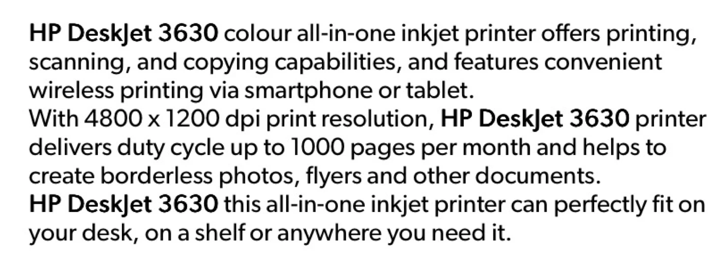 With 4800 × 1200 dpi print resolution, HP DeskJet 3630 printer delivers duty cycle up to 1000 pages per month and helps to create borderless photos, flyers and other documents.