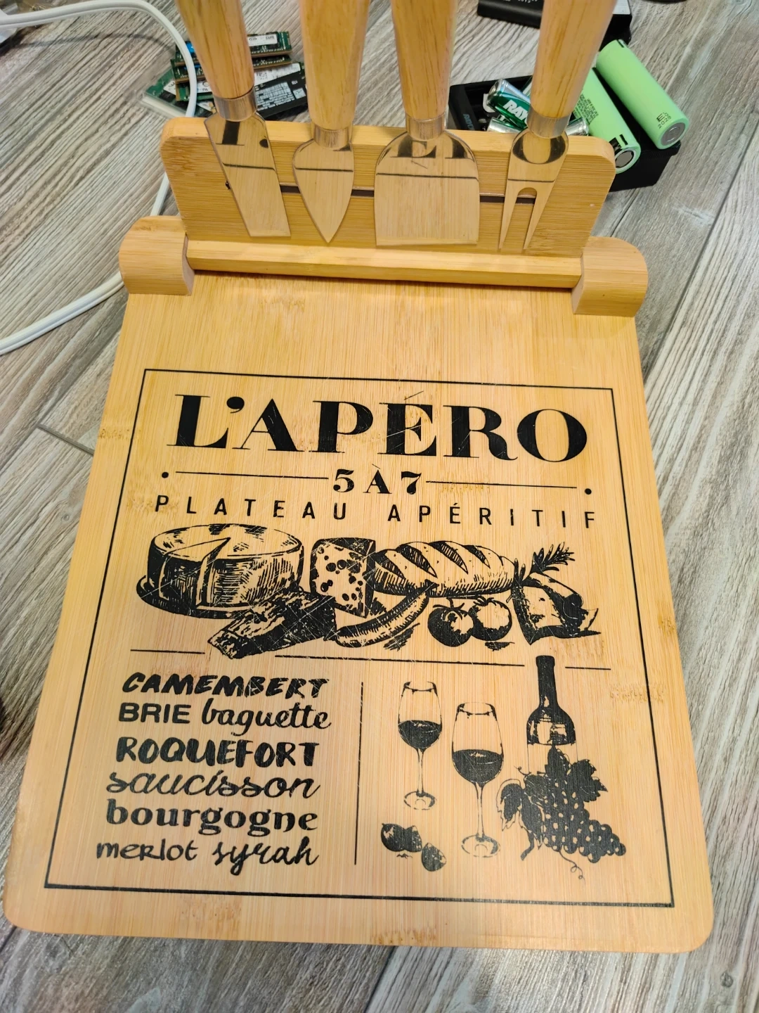 Selling a charming L'Apero cheese board, perfect for your next get-together! It comes with a set of knives for serving all sorts of cheeses, from Camembert to Roquefort. The board has a delightful design featuring various cheeses, baguettes, and even wine. A stylish way to present your appetizers! Brand new