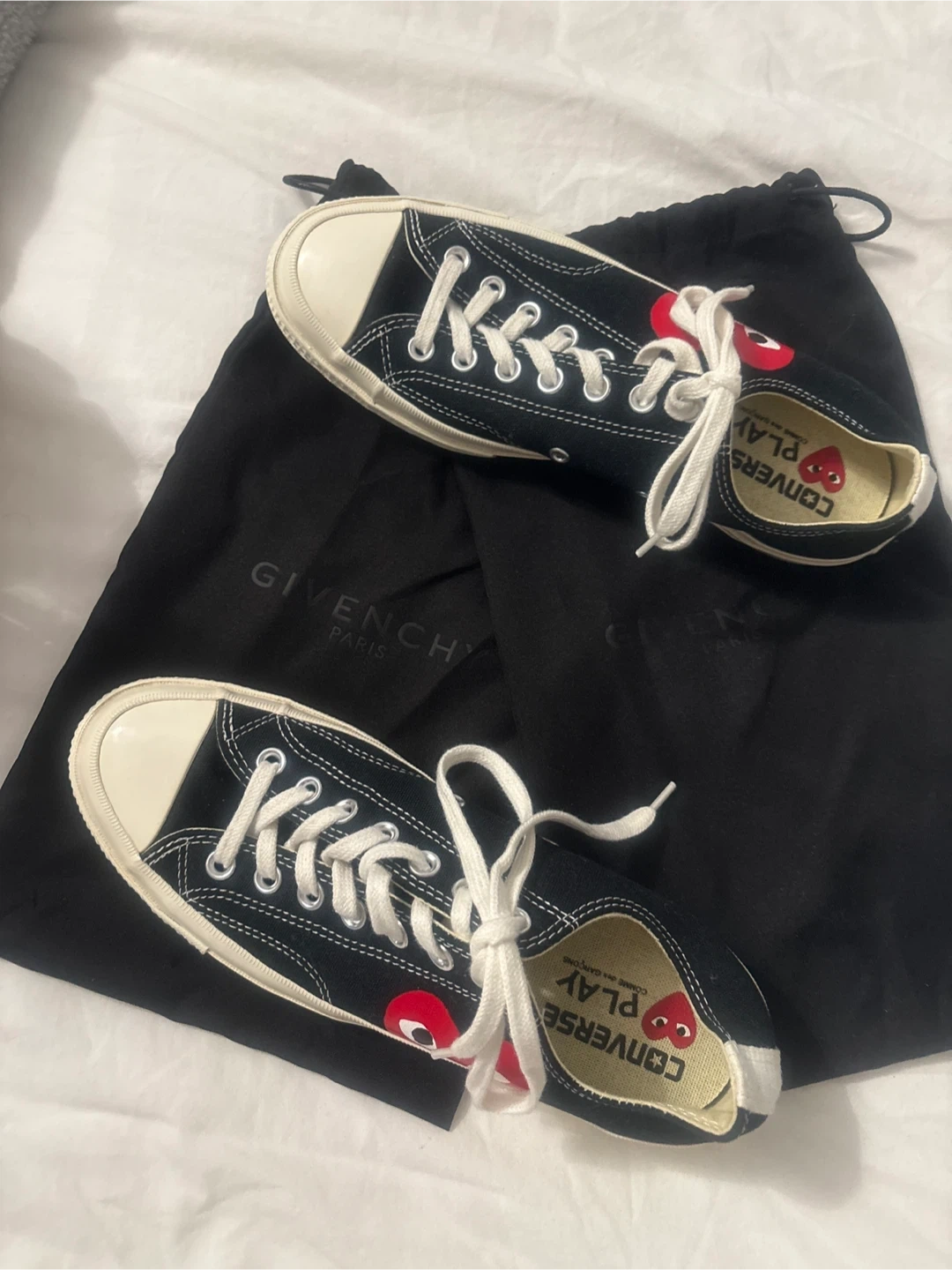 Selling a pair of Converse x Comme des Garçons PLAY sneakers! These black low-tops feature the iconic red heart logo. They are brand new and ready for a new owner