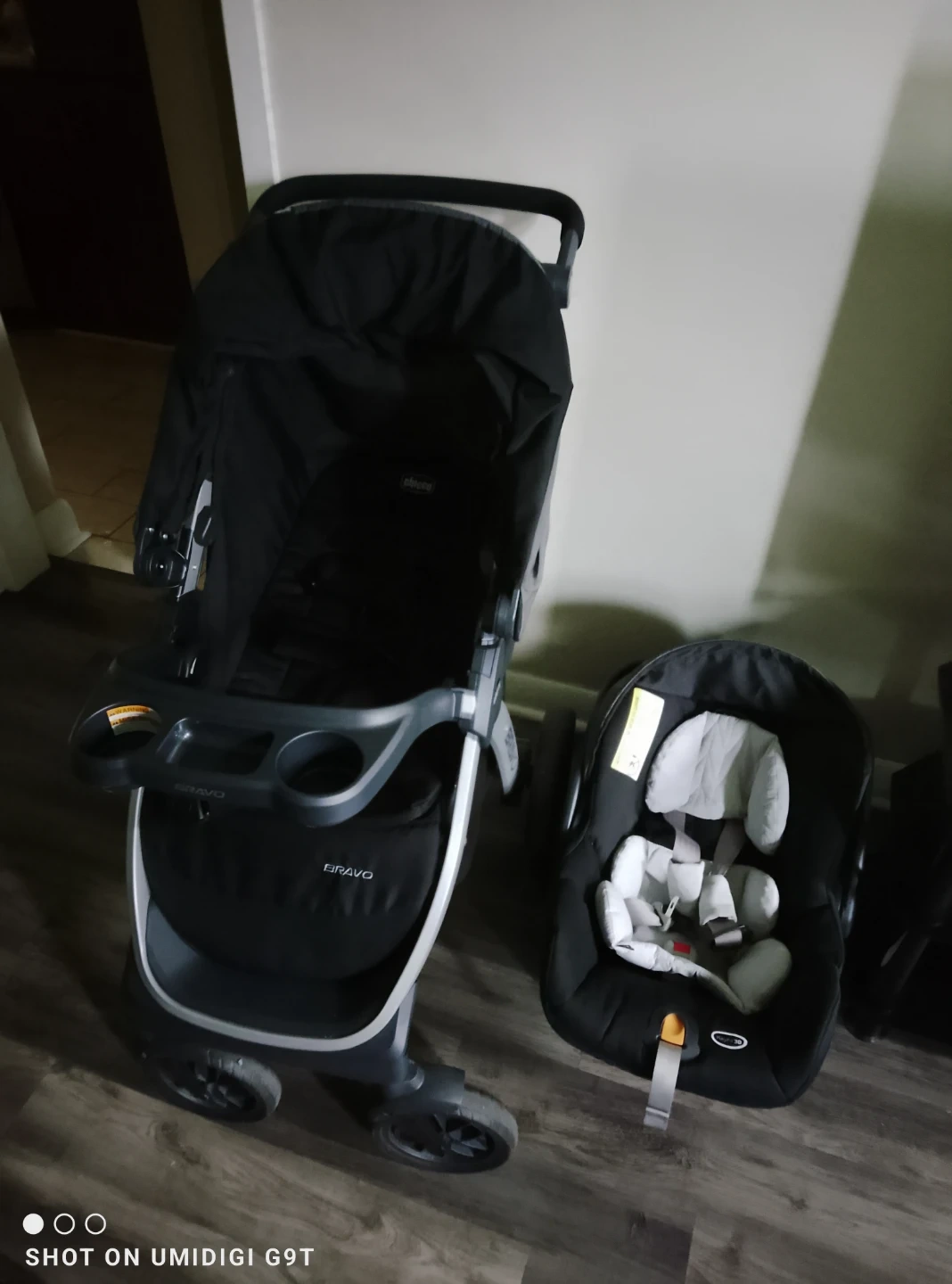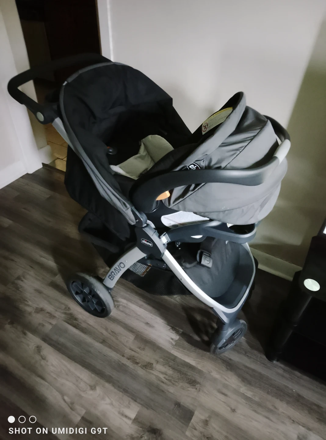 Selling a Chicco Bravo travel system, which includes the stroller and infant car seat with base! It's in great condition and ready for a new family. The system is black and grey.
