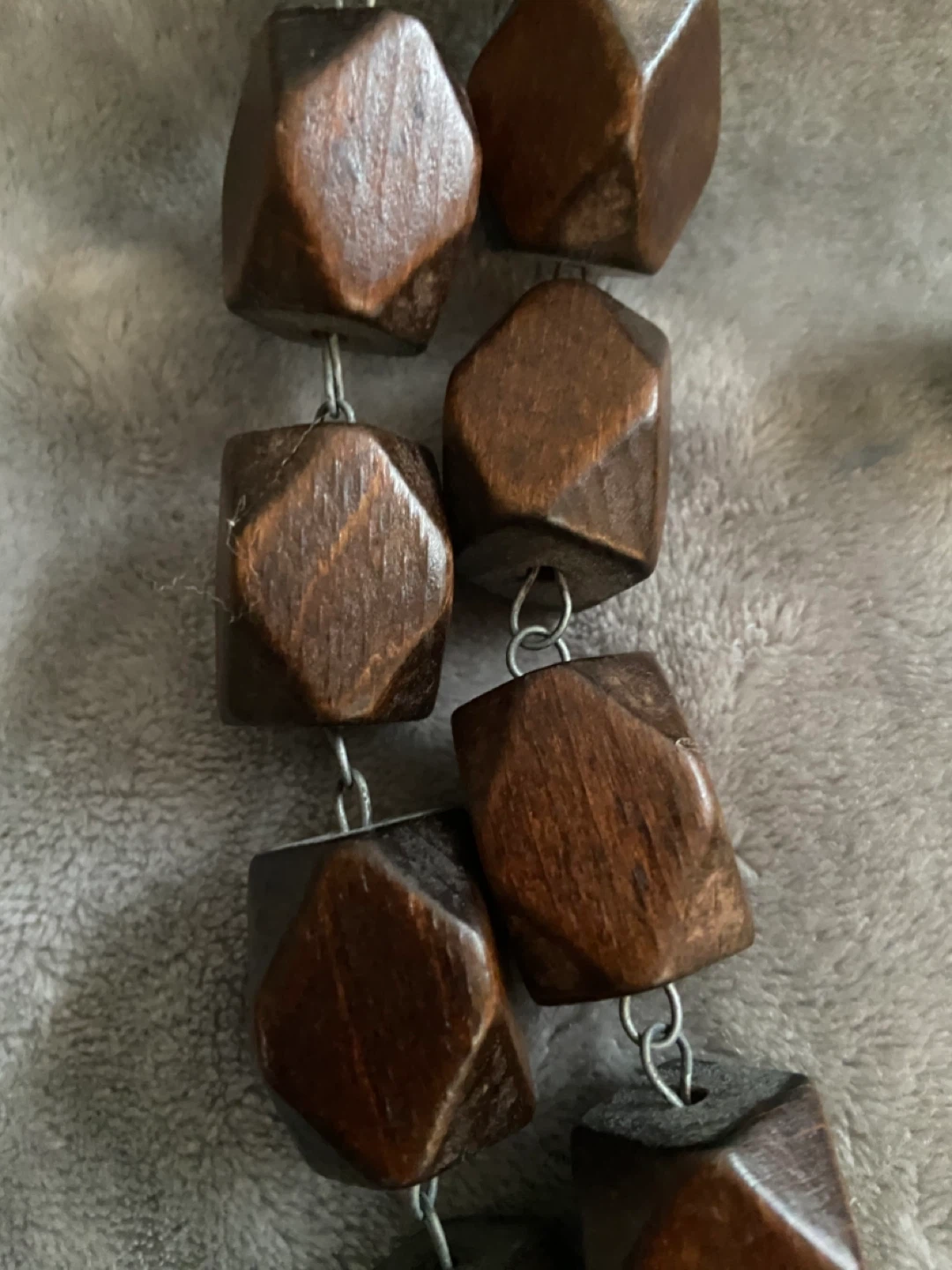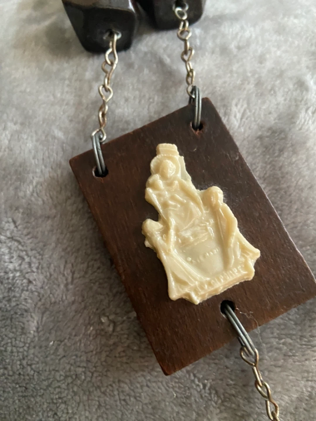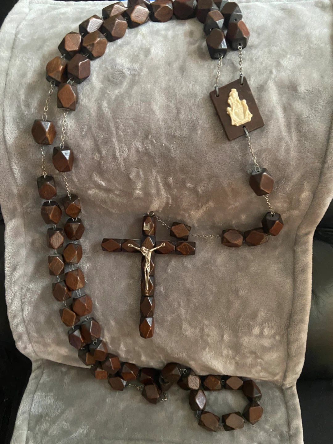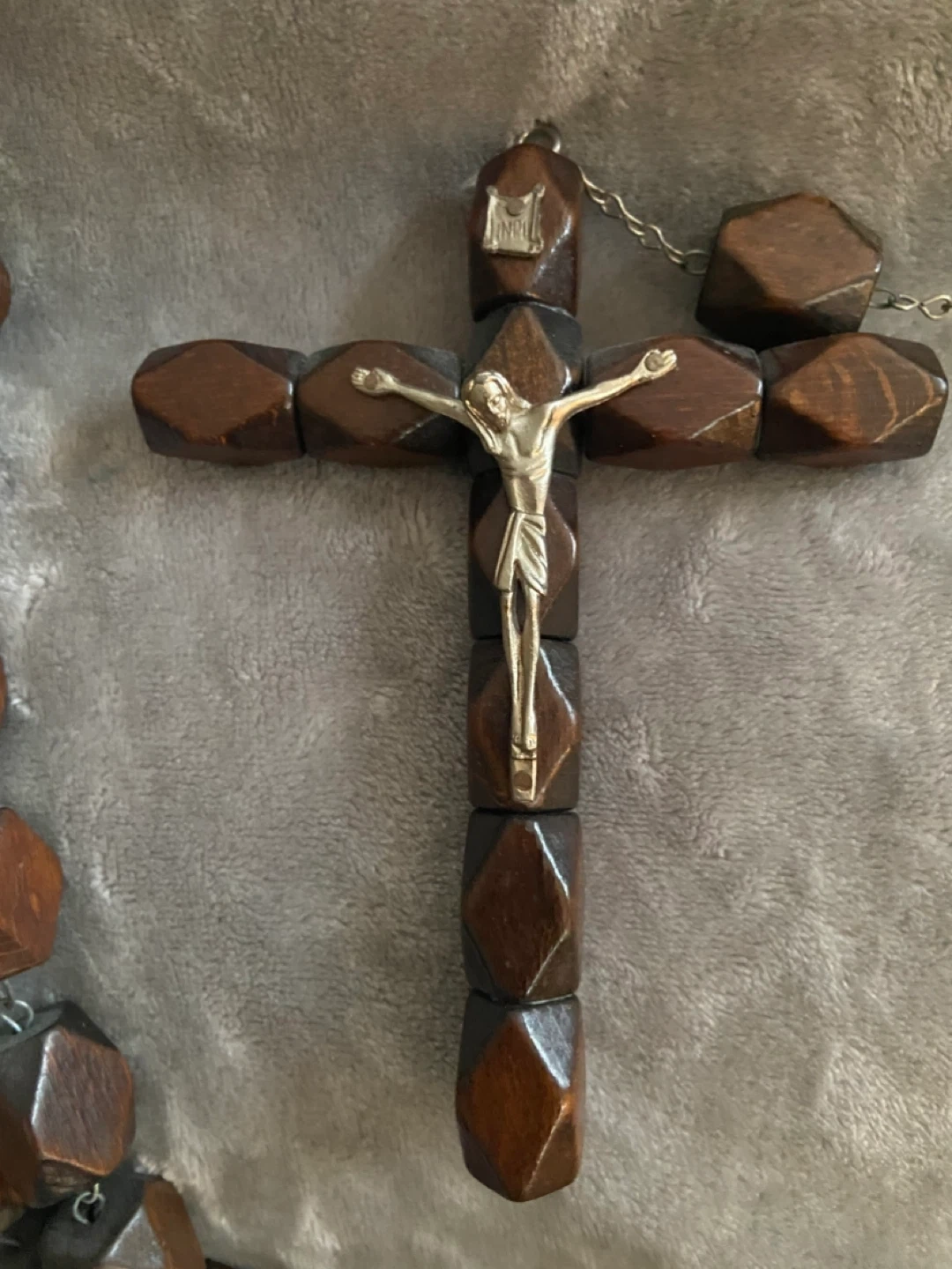 This is a vintage wooden rosary. It's in great condition considering its age and has a unique, rustic charm. The beads are made of wood, and it features a metal crucifix and a centrepiece with a religious figure. This rosary would be a wonderful addition to any collection or for personal use as I had used it as a bedroom wall design . I've seen similar rosaries listed on sites for around $40-$60, so I'm pricing this one at $50, given its condition and unique appearance. If the ad's up, it's available!